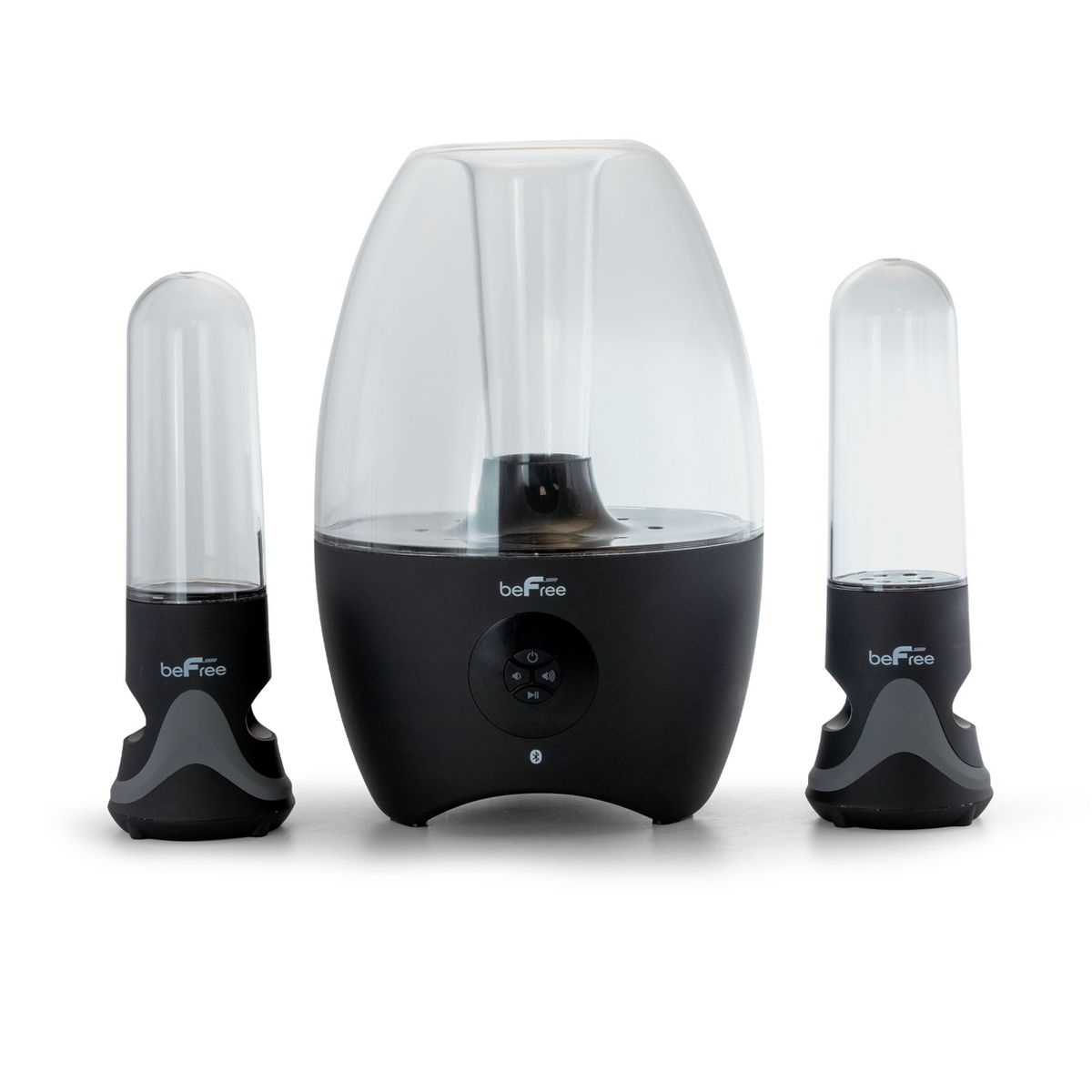 Let beFree Sound's 2.1 Channel Wireless Multimedia LED Dancing Water Bluetooth Sound System whisk you away with the hypnotizing motion of dancing water and striking bright lights. This multimedia system is ideal for entertaining your guests and bringing more excitement and appeal to any event. This unit is more than just an amazing party speaker system. While this multimedia system is wonderful for entertaining guests, it is also the ideal companion for rest and relaxation. The reactive lights and dancing water streams will lull you into a peaceful state of mind. Item includes: 1 sub-woofer and 2 satellite water speakers Item measures: Subwoofer: 8.5" Width, 12.5" Height, 4.5 lb. Weight Satellite Speakers: 3.5" Width, 10.5" Height. 1.0 lb. Weight