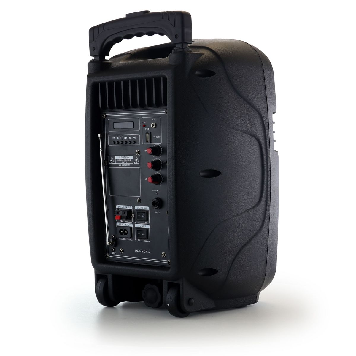 The beFree Sound 8 Inch 400 Watts Bluetooth Portable Party Speaker with USB, SD Input and Reactive Lights brings more power and sound to house parties and other events. Dazzle the stage with an array of illuminating light patterns built into the speaker. Bring along to camping trips or backyard barbeques, with the portable handle bars and wheels this party speaker can go anywhere. Great for an at home or dive bar karaoke night. Never let the party simmer down, the 12v rechargeable battery can last till the night ends!