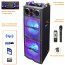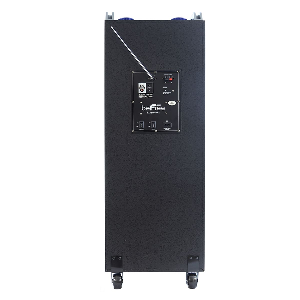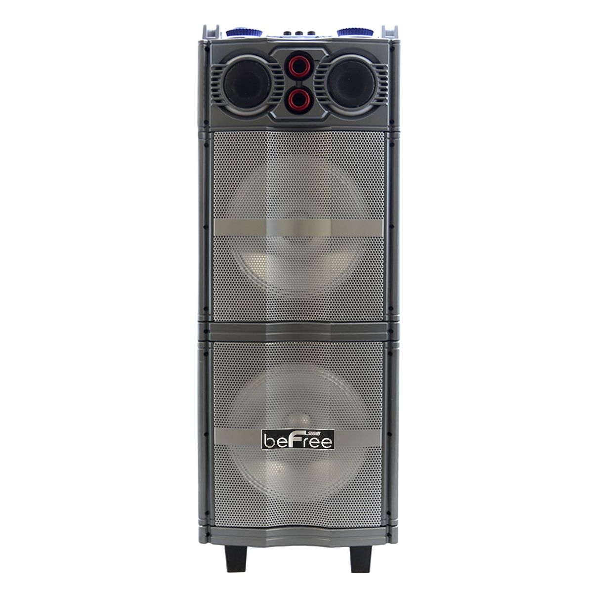 beFree Sound's Sound Double 10 Inch Subwoofer Bluetooth Portable Party Speaker is an all in one party companion! This Speaker not only delivers clear and extremely power sound, but provides a light show to go with it. Each of the large 10 inch Sub-woofers has built in reactive party lights which illuminate and liven up any scene. The unit features a top control panel with two large illuminated volume control nobs with a stunning blue halo light. Separate volume control for the included Microphone and the general speaker volume allow you to control the sound settings to perfection. Whether you will you this unit for public speaking, or social events, you simply can't go wrong. Includes Remote Control: Requires 2 x AAA Batteries (Batteries not included) Includes Wireless Microphone : Requires 2 AA Batteries (Batteries not included) Separate Light ON/OFF Switch