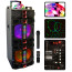 The new beFree Sound Dual 12 Inch Sub woofer Bluetooth Portable Party Speaker With LED Lights, USB/ SD Input, Rechargeable Battery, Remote Control And Wireless Microphone is an all in one entertainment assistant for the most advanced entertainers around! This easily portable speaker includes hard mounted top handles for your convenience, and boasts a large frame to ensure it's highly visible. With such a Colorful Light Show Display, this sound system is sure to pump up the party in a whole new way. While your guests may already enjoy your music selections, this speaker will help you take your entertaining to a higher level. You can connect a variety of devices, and choose the input that is best to suit your needs. You always have the option of turning down the reactive light show for those more subtle gatherings and allowing yourself to enjoy the strong, clear sound provided by the Dual 12inch Sub woofers.