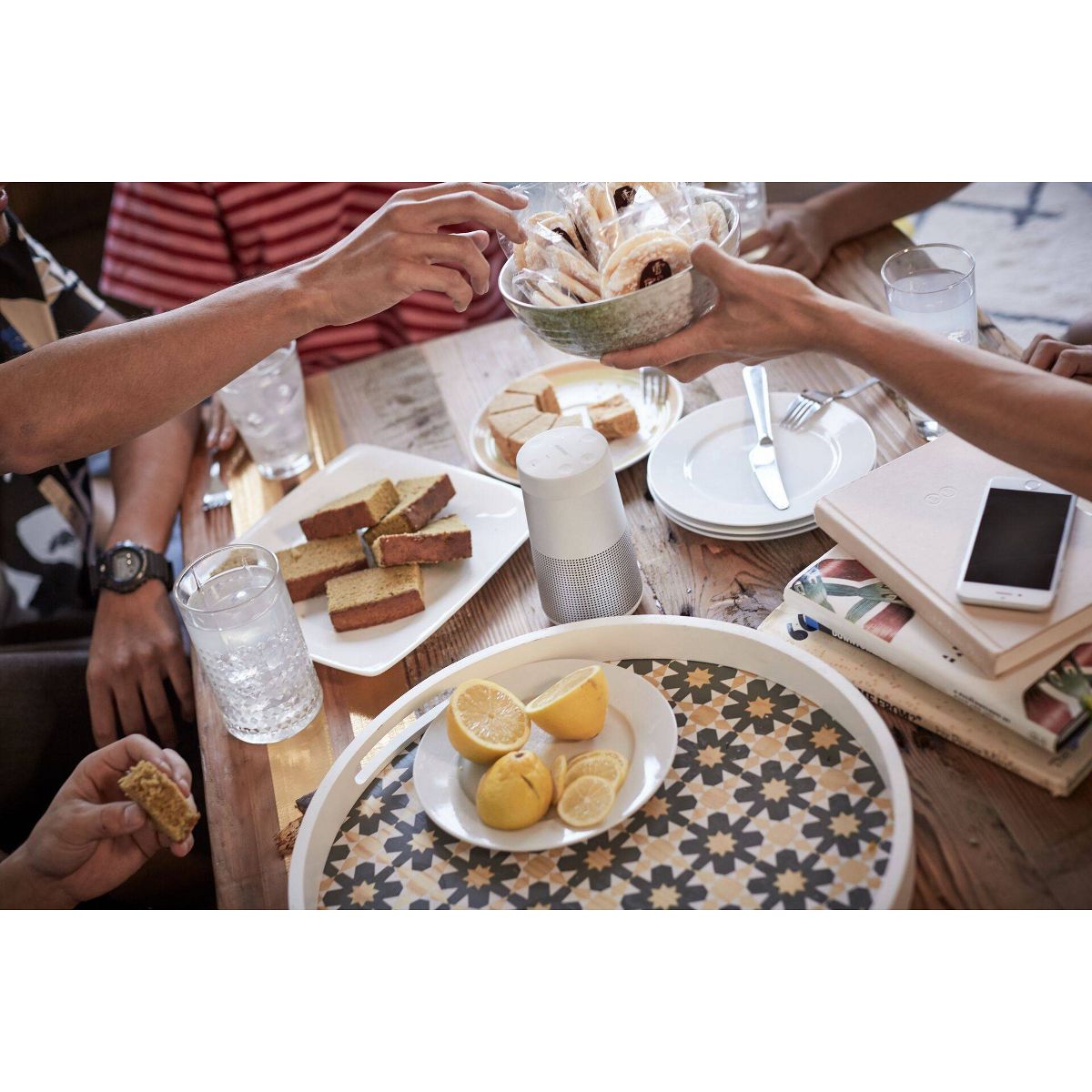 Deep. Loud. And immersive, too. The Bose SoundLink Revolve II Portable Bluetooth Speaker delivers true 360° sound for consistent, uniform coverage. Place it in the center of the room to give everyone the same experience. Or set it near a wall and sound will radiate and reflect around the room, immersing you in that same feeling you felt at your favorite show. The tapered cylindrical shape makes this wireless speaker easy to grab and go, while a durable aluminum body provides worry-free protection. Great for indoor or outdoor use, with a rechargeable, lithium-ion battery that plays up to 13 hours. And it’s water resistant so you can keep the party going, even if it starts to rain. Voice prompts talk you through Bluetooth pairing, and there’s a built-in speakerphone for calls. Use Bose SimpleSync ™ technology to sync your SoundLink Revolve II Bluetooth® speaker to other Bluetooth speakers and headphones around the house. Keep the party going, no matter the room, at the press and hold of a button. Available in Triple Black or Luxe Silver.