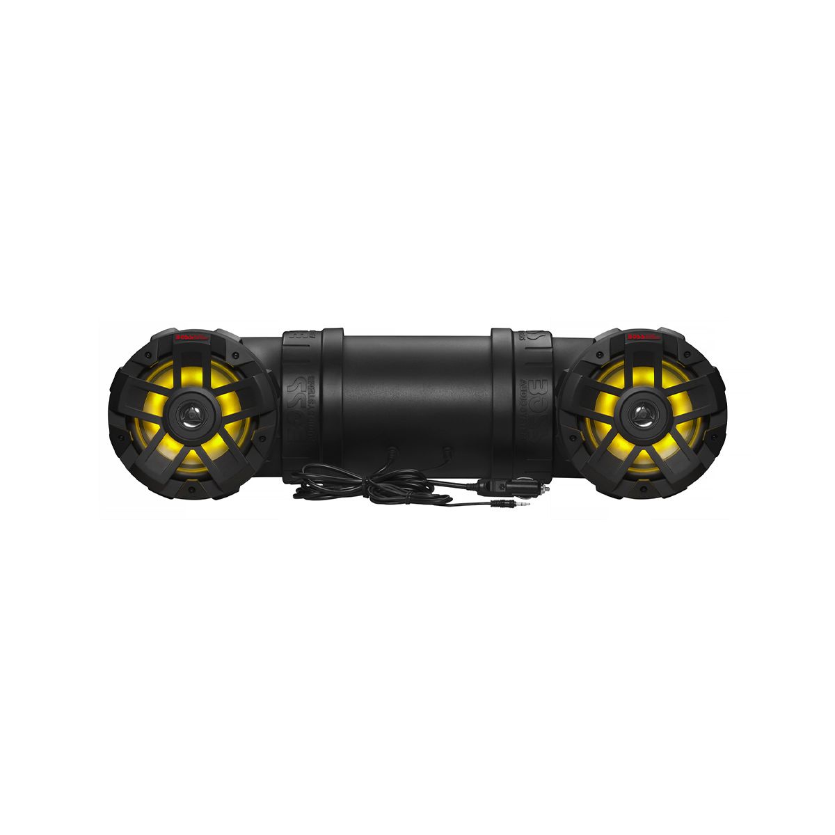 You can take your jams with you anywhere you go with this weatherproof sound system as long as you have a 12-volt power source. The built-in amplifier boasts 450 maximum watts of sound power that will enhance the life of your outdoor gathering. The 8-inch poly-injected cone speakers and 1-inch high-performance dome tweeters will present your music with dynamic clarity. You can hook up your smartphone or portable mp3 player via the auxiliary input or you can stream your music in with the Bluetooth option this ATV boombox is outfitted with. Add some mood lighting to your gathering with the RGB LED color-changing speakers. Don't worry about the elements bringing down your jams, as this weatherproof soundbar is completely marinized to protect it from water and weather.