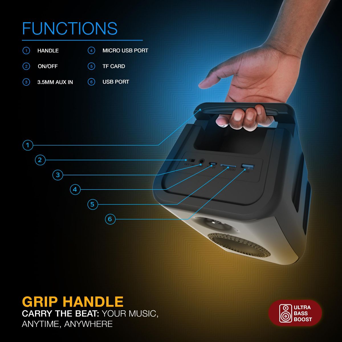 • POWERFUL & PORTABLE ' Our lightweight, compact design and integrated carry handle let you start the party anytime, anywhere. Enjoy your favorite music in rich HD audio with warm tones and powerful boosted bass no matter where your adventures take you. Start a party at the beach, groove with friends in the backyard, or set a celebratory mood at your next tailgate.