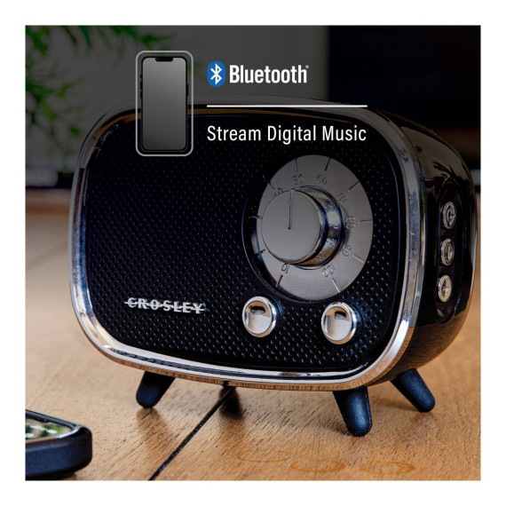 The tiny but mighty Rondo Bluetooth Speaker from Crosley brings on the retro space-age vibes. Side controls allow you to wirelessly accept calls, adjust volume and skip tracks while USB, mini SD and charging ports are housed in the back of the unit. Faux chrome trim and tapered legs enhance the Rondo’s mid-century modern silhouette. 4.72”W x 2.95”D x 3.66”H