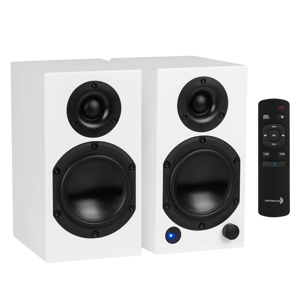 Discover the immersive sound of the Dayton Audio® M4 Bluetooth® Powered Bookshelf Speakers, where compact size meets exceptional audio performance. Despite the M4’s small size, this pair of speakers deliver an audio experience that's nothing short of spectacular. With Signature™ Series 4-in. aluminum woofers, 1-in. silk dome tweeters, and internally optimized DSP, the M4 speakers produce robust sound and exceptional imaging, ensuring every note and lyric is rendered with clarity and precision. The high sensitivity of the Signature™ Series woofers takes advantage of every watt generated by the built-in 150-watt peak amplifier leading to explosive SPL levels. The fabric dome composition of the tweeters allows for a smooth response with wide dispersion enabling an expanded listening window. Whether adorning your desk or a cozy spot on your bookshelf, these speakers deliver a rich and expansive soundstage, ideal for every musical genre. Stream wirelessly via Bluetooth®, indulge in high-resolution audio through the USB-C® DAC, or connect almost any device directly to the analog input. With the M4, the music is yours to enjoy and explore, unveiling new favorites with every listen.