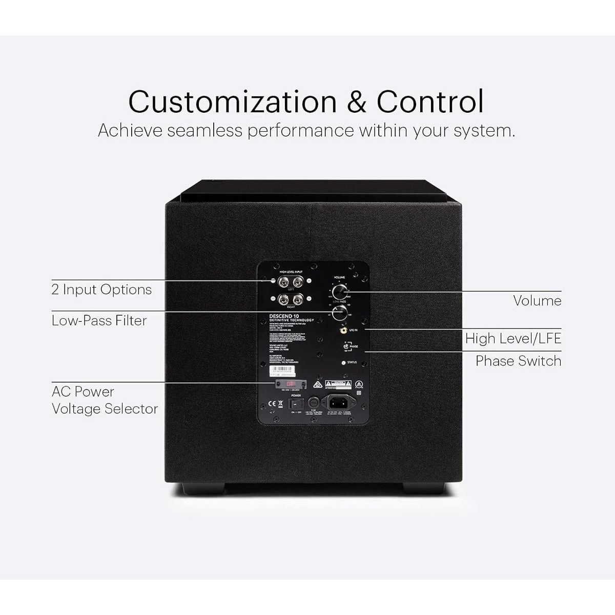 With Definitive Technology’s new 3XR Architecture featuring three-times the bass-radiating surface area of other 10” subs, the Descend DN8 performs like a 12” sub in a 10” driver cabinet and delivers louder and clearer lows without any unwanted port noise distortion. Outfitted with dual 10” Bass Radiators that are pressure coupled to the 10” driver and 500W peak Class D amplification that deliver massive, impactful bass with amazing speed, musicality, and control even at 28Hz. Equipped with built-in controls, easily accessible at the back panel, you can adjust volume, low pass filter and phase control (0/1100°) for a personalized listening experience. Set power toggle to Auto on/off or DC control for fast and easy on/off power switching in the sub and other home theater equipment. Digitally optimized to take your movies and music to the next level, the Descend DN10 is a perfect complement to any home theater system as it allows easy connectivity via LFE or stereo line level RCA inputs (cables not included). Add another, same-model subwoofer to your home entertainment setup to dramatically improve realism and ensure smoother bass throughout the listening area. Be at the center of action from virtually any part of the room!