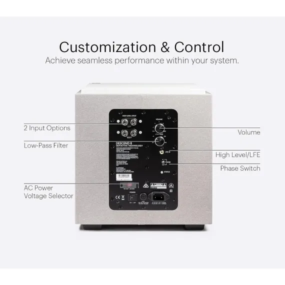 Definitive Technology Descend DN8: Compact Subwoofer with Powerful BassDescription:The Definitive Technology Descend DN8 is a compact, digitally optimized subwoofer that delivers powerful, room-filling bass for your home theater or music listening experience. It features Definitive Technology's innovative 3XR Architecture, which uses dual 8-inch passive radiators to achieve the low-frequency extension of a much larger subwoofer. The DN8 is also equipped with a 500-watt peak Class D amplifier that provides ample power for even the most demanding listening applications.Key features: