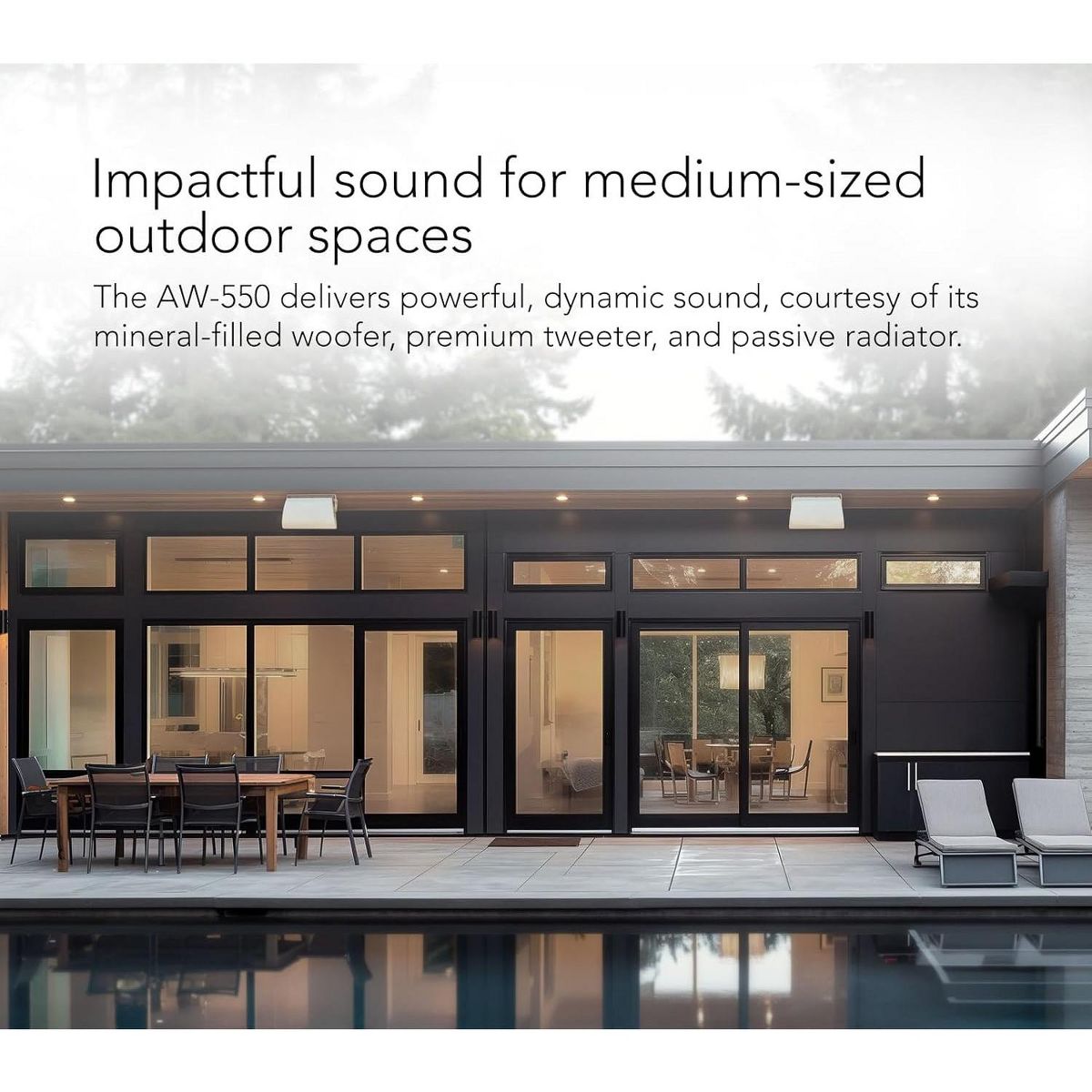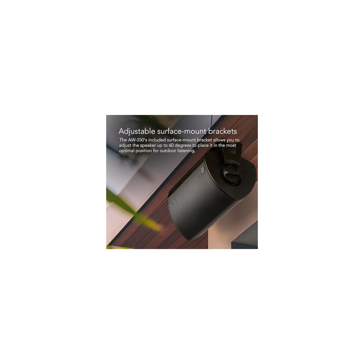 LOUD SPEAKER PAIR FOR MID-SIZED OUTDOOR SPACES: The Dymension AW-550 Outdoor Speakers feature (1) 5.25" mineral-filled woofer, (1) 1" tweeter, and (1) 5"x8" advanced passive bass radiator for lifelike sound with uncompromised clarity and detail ALL-WEATHER STEREO SPEAKERS: Rated IP66 for all-weather protection, these home speakers have a rigid and rugged enclosure with silicone-sealed connections to withstand the harshest conditions like rain, snow, or dirt to deliver premium sound UNCOMPROMISED AUDIO OUTPUT: The AW-550 outdoor speaker pair leverages Definitive Technology’s innovative acoustic technologies. From grooving melodic lines to vocal nuances, experience every detail in stunning fidelity with these wall mount speakers SUITABLE FOR YOUR COZY OUTDOORS: Enjoy your favorite tracks by installing these Definitive Technology speakers in your spacious backyard garden, balcony, porch, garage, hallway, deck, or patio area for impactful sound that is clear and crisp CUSTOMIZE YOUR AUDIO SETUP: Enjoy seamless, cohesive sound across your audio setup with timbre-matched Definitive Technology Dymension speakers. Whether indoors, outdoors, or in transitional spaces, combine speakers for a dynamic listening experience CONVENIENT INSTALLATION: These wired speakers come with a surface-mount bracket that makes installation. Additionally, you can adjust the speakers up to 60 degrees to place it in the most optimal position for outdoor listening › See more product details