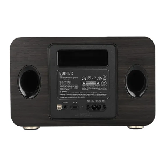 The Edifier® D32 Tabletop Wireless Speaker is a retro-style and fashionable tabletop combo speaker with a handmade wooden speaker case, braided speaker grille, and accordion keyboard. It will complement whatever style your room décor might be. It also can play Hi-Res Audio up to 24 bit/96 kHz end-to-end! The Bluetooth® v5.3 audio receiver supports LDAC codec with a transmission bit rate of up to 990 kbps. It also allows for the simultaneous connection of 2 Bluetooth devices, making it easy to switch between audio sources. The tabletop speaker is also equipped with 2.4- and 5-GHz Wi-Fi® modules. It supports Apple® AirPlay® and AirPlay®2 so you can stream music through Wi-Fi® from your iOS™ devices, Apple TV®, and iTunes®-installed computer to the speaker. Group 1 or more D32 speakers into your multi-room music system and enjoy seamless music listening throughout your house. A high-capacity 7.4-volt, 5,200-mAh battery pack is embedded in the cabinet, providing enough power for continuous playback for up to 11 hours per charge. And the D32 works with the Edifier® ConneX app, where you can access the source switch, playback control, sound effects, etc.