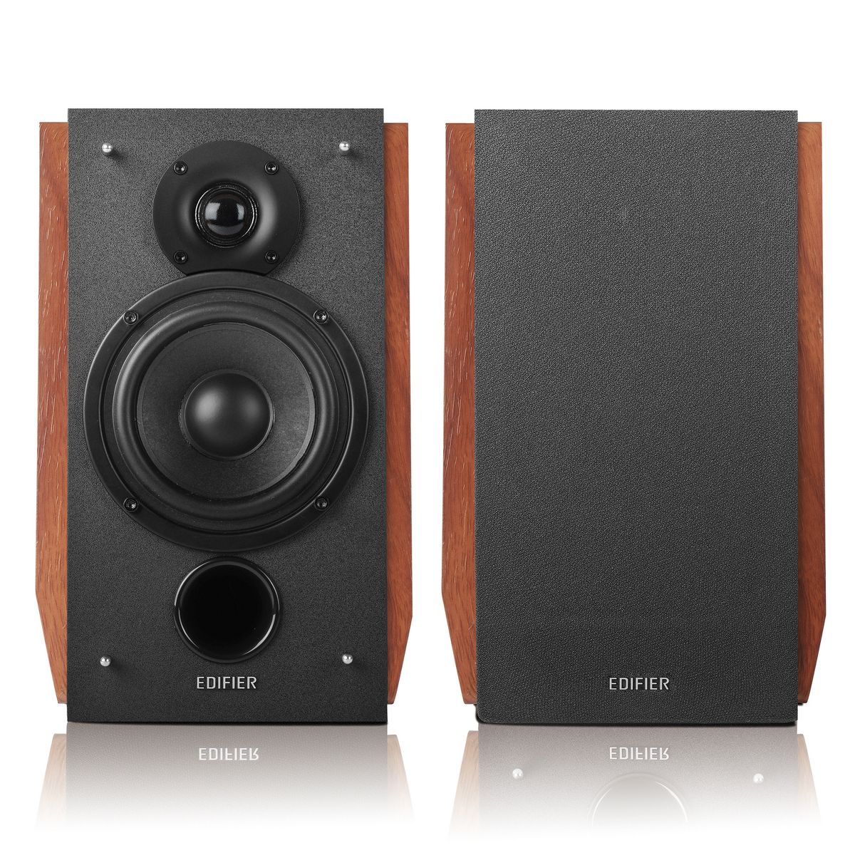 The Edifier® R1700BTs Bluetooth® Bookshelf Speaker Pair with Soundfield Spacializer allows these near-field monitors to product a panoramic sound stage. And each speaker base is angled at a 10-degree incline for dynamic precision and delivery. Made from MDF wood with a walnut, wood-finish vinyl, the speaker pair makes the ideal addition to your living room, office, or study. Bluetooth® connectivity lets you playback from your phone, laptop, or tablet and is compatible with iOS™, Android™, Mac®, or Windows® devices. The Edifier® R1700BTs active Bluetooth bookshelf speakers make even hardly noticeable sounds very clear. And the DSP (Digital Signal Processing) and DRC (Dynamic Range Control) help minimize distortion for improved audio even at low volume. The R1700BTs even has a subwoofer output so you can easily add your own sub for even more bass to create a 2.1 music system.