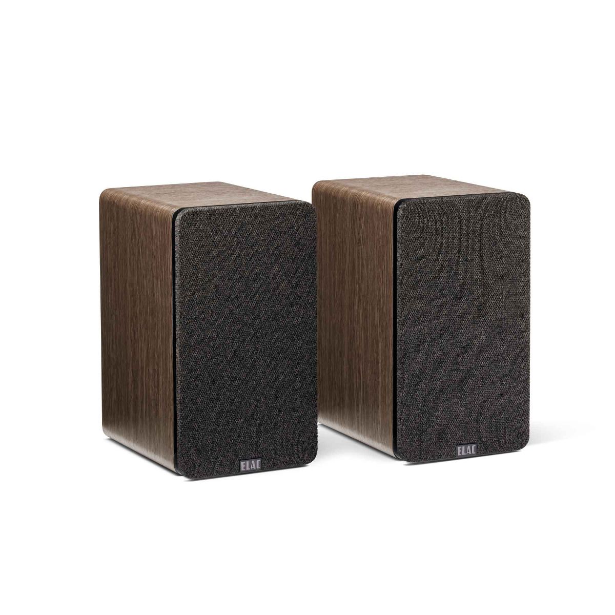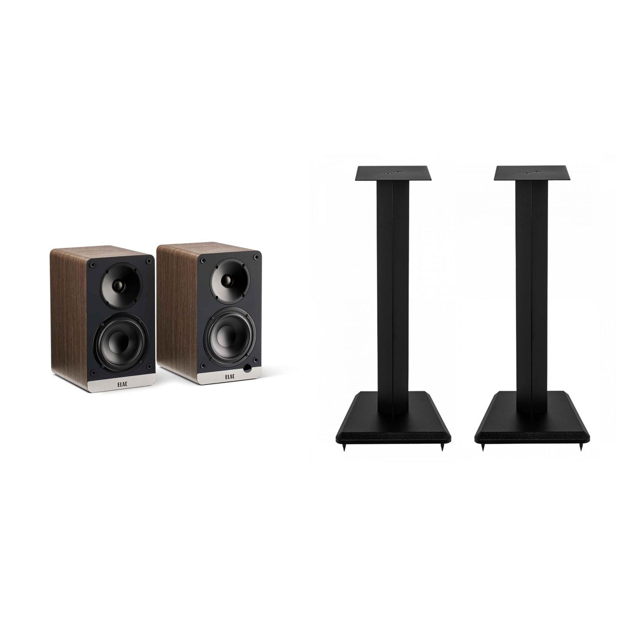 Introducing the Elac Speaker Bundle featuring the LS10-B 23" Steel and Wood Speaker Stands in Black, Pair, and the DCB41-WN Debut ConneX 4.5" Powered Speakers in Walnut, Pair.