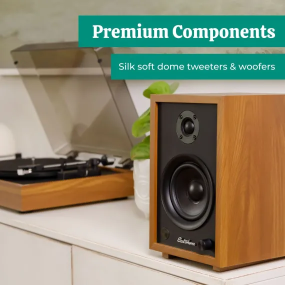 The Electrohome McKinley Powered Bookshelf Speakers offer a powerful audio performance while effortlessly connecting to your source so you can focus on the music. Adorn any music sanctuary with these retro aesthetic powered speakers without sacrificing modern features.