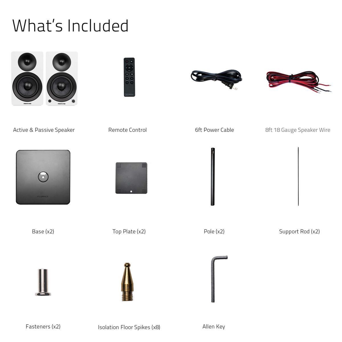 What's Included: Ai41 Powered Bookshelf Speakers (pair), Remote Control, 2x AAA Batteries, 6ft Power Cable, 8ft 18 Gauge Speaker Wire, 2x Base, 2x Top Plate, 2x Pole, 2x Support Rod, 2x Fasteners, 8x Isolation Floor Spikes, Allen Key, Quick Start Guide, Fluance Catalog, 2 Year Full Manufacturer's Direct Warranty for Ai41 Powered Speeaker and 1 Year Manufacturer's Warranty for Speaker Stands