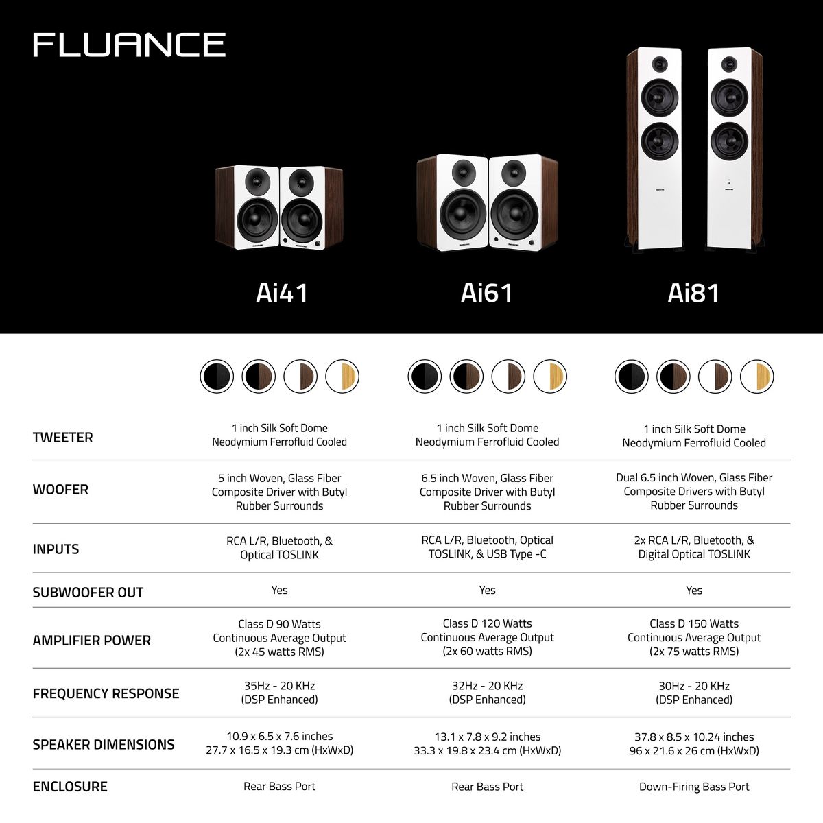 What's Included: Ai81 Powered Floorstanding Speakers (pair), Remote Control, 2x AAA Batteries, 6ft Power Cable, 8ft 18 Gauge Speaker Wire, Quick Start Guide, Fluance Catalog, 2 Year Manufacturer's Warranty