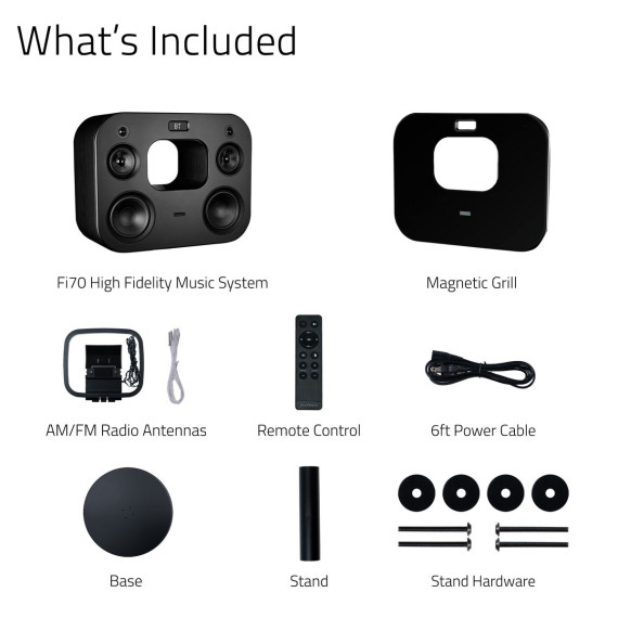 What's Included: High Performance Wireless Music System, Low Profile Stand with Mounting Hardware (Not Required), 4x Rubber Feet, Remote Control, AM/FM Radio Antennas, Quick Start Guide, 2 Year Parts and Labor Warranty