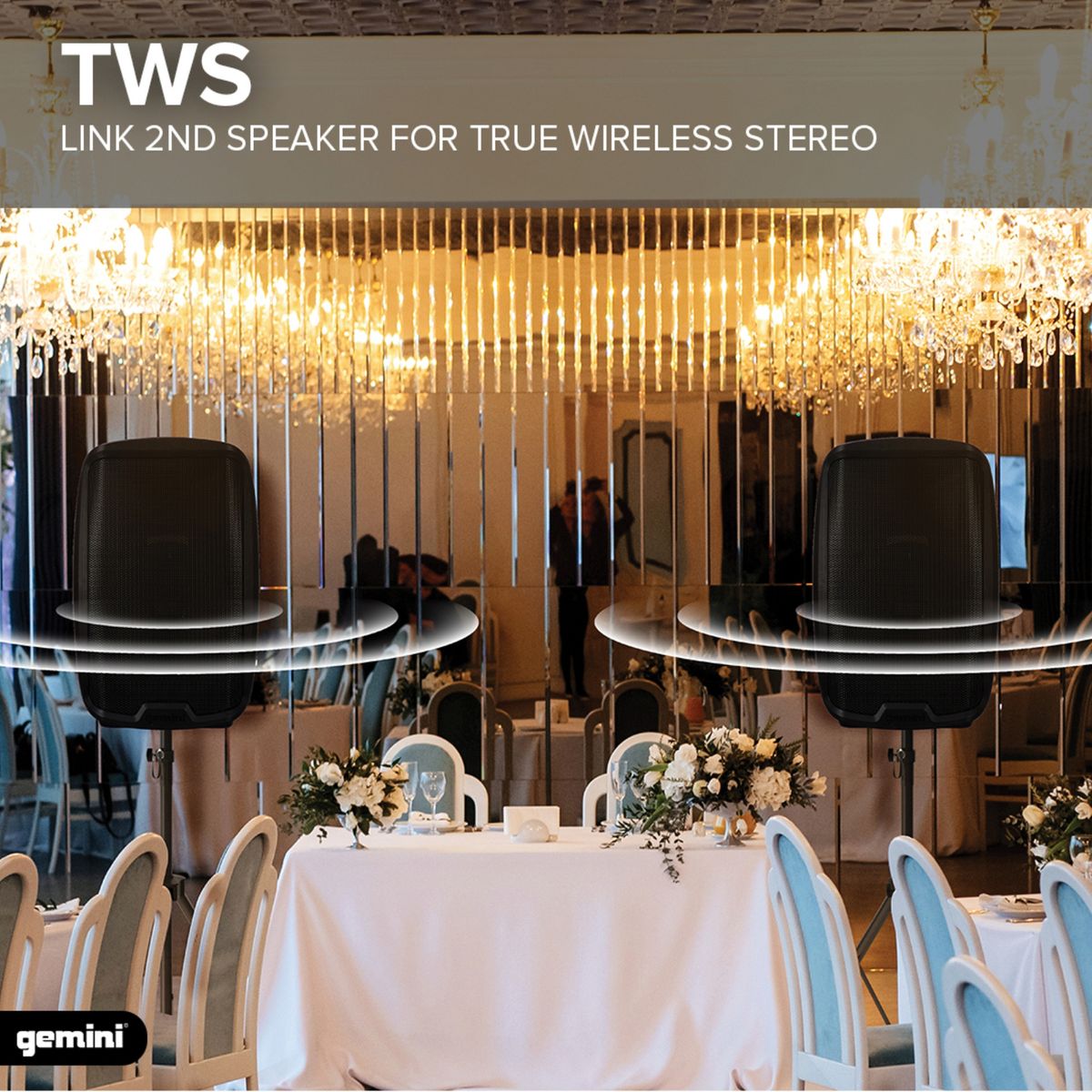 This lightweight, ultra-efficient powered Gemini 2,000-Watt Active 15-In. Bluetooth Loudspeaker is designed for optimal performance, no matter where you take it. The Gemini AS-2115BT is a 2-way full-range PA speaker with room-filling sound in a compact, durable enclosure. Its 15-in. low-frequency driver with 2-in. voice coil and pure titanium 1-in. high-frequency compression driver provide the ideal combination of deep low and crystal clear high frequencies. The built-in media player allows for MP3/WAV playback via USB and SD card as well as FM radio. With so much power under the hood in a compact package, it's ideal for any occasion.