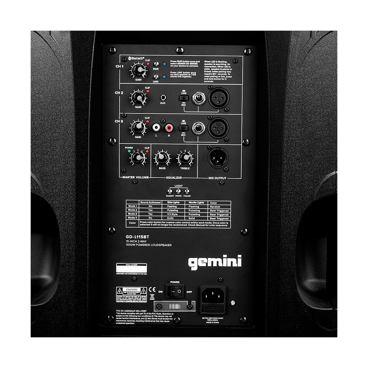 Active PA speaker with integrated 3-channel mixer and adjustable beat-synced party lights. The GD-L115BT features Bluetooth playback, dual XLR, 1/4" mic/line, RCA and AUX inputs. Each channel has independent level controls and clip LED. It also has master level with bass and treble controls for adjusting EQ. I/O includes a balanced XLR output allows for the connection of additional speakers. High-efficiency Class-D amplifiers deliver enormous power—1,000W peak (700W LF + 300W HF), 500W continuous RMS (350W LF + 150W HF)—driving a hearty 15" deep bass woofer with a high-temperature voice coil. The GD-115BT’s versatile enclosure allows different positioning—stand-mountable or tilt on edge for wedge monitor.