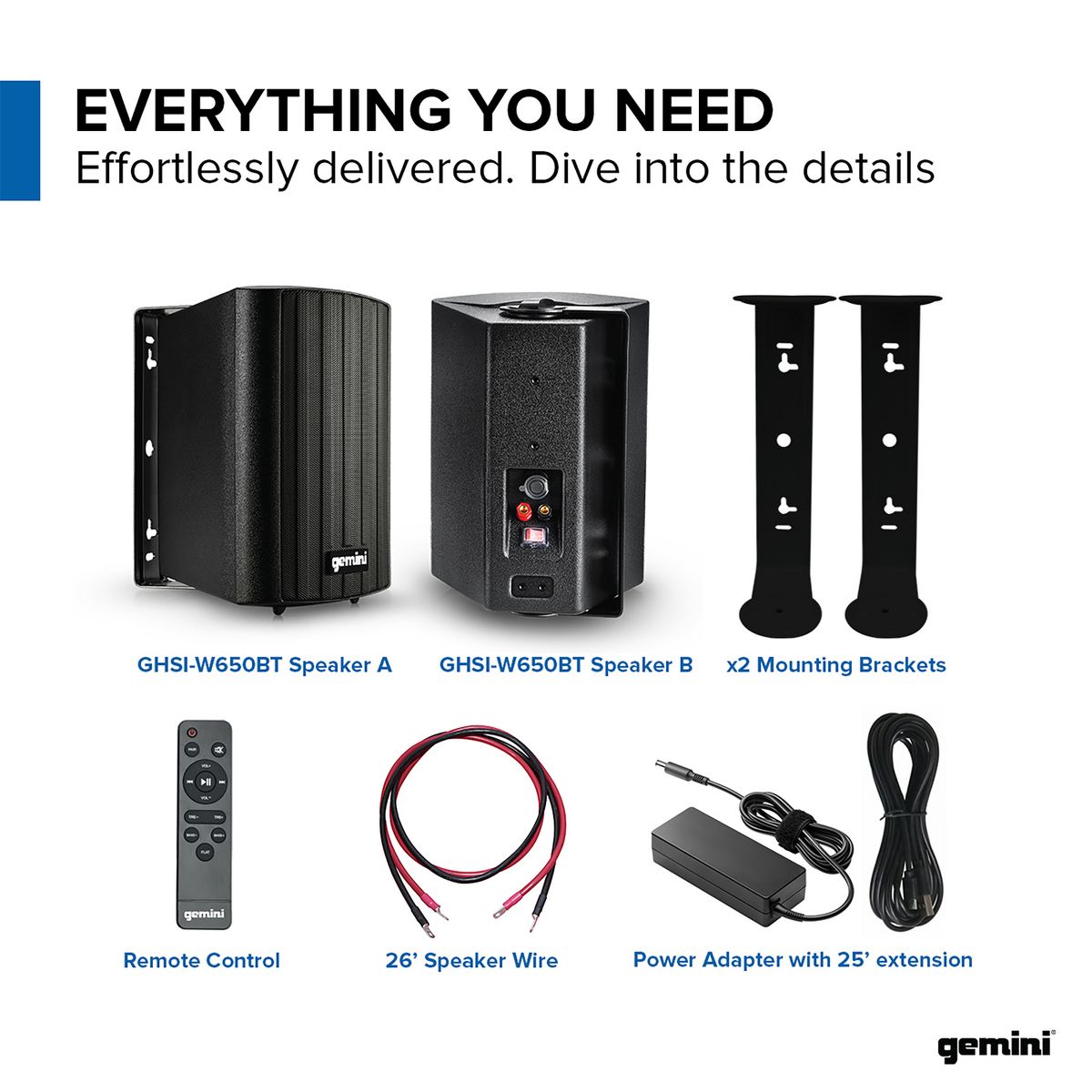 Gemini® GHSI Series GHSI-W650BT-PR Outdoor Bluetooth® 300-Watt-Peak Outdoor Speaker Set with Mounting Brackets and Remote, 2 Count (Black)
