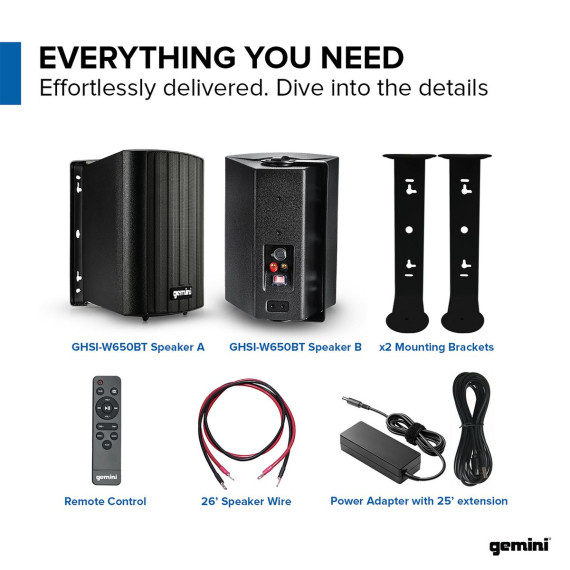 Are you ready to elevate your outdoor audio experience to the next level? The Gemini® GHSI Series of outdoor mountable speaker pairs will add premium sound quality and convenience to your backyard, patio, or even your boat. With a 3.5-mm aux input in addition to Bluetooth® connectivity, you have 2 ways to enjoy your music outdoors. Each speaker features a 6.5-in. woofer and 1-in. tweeter for superior outdoor audio across the frequency spectrum. Whether you're setting the mood in your backyard, hosting an event on your patio, or rocking out on your boat, these speakers have got you covered. Their IP44 waterproof rating ensures they can withstand the elements, so you can leave them outside without worry. The adjustable mounting brackets make installation a breeze while optimizing sound dispersion as you can mount them horizontally or vertically. Connect effortlessly via Bluetooth® or the aux input and take control with the included wireless remote. Use the aux output to expand your system, allowing you to daisy chain several units together! These speakers are expertly tuned for outdoor use, delivering immense sound from a compact package.