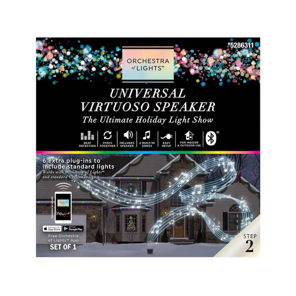 Part of the Orchestra of Lights collection, the Universal Virtuoso Speaker adds music to your synchronized light show. Bluetooth-enabled with beat detection, the Universal Virtuoso Speaker includes six preprogrammed holiday songs. You can also play your own music with the light show—but don't stop there! This amazing speaker includes six additional plugins so you can add your own standard lights or lighted decor to the show! Once added, your lights will dance the the beat of the music! The Universal Virtuoso Speaker works with the Orchestra of Lights Indoor Hub and free app and syncs with other items in the collection. REQUIRED: The program requires the Indoor Hub. Only one Hub is needed to control 20-25 items from the collection. For indoor and outdoor use.