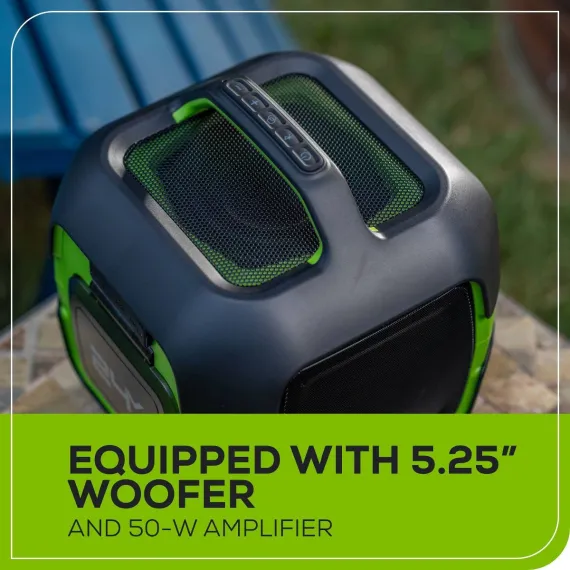 The Greenworks POWERALL™ Cordless 24V Bluetooth Speaker delivers loud and clear sound with its powerful 5.25” woofer and 50-watt amplifier. Listen to your favorite music the way it was made to be listened to with high quality, full surround sound. Effortlessly connect your devices with Bluetooth connectivity ranging up to 164 ft. Its hybrid performance allows you to play wirelessly with the included POWERALL™ 24V 2.0Ah battery or plugged into a power source with the included extension cord. Cordlessly connect to other Greenworks Bluetooth speakers (sold separately) to play music simultaneously and amplify your sound. Featuring a built in USB Type-A and USB Type-C port allowing you to charge other devices such as phones, tablets, and more. The Greenworks POWERALL™ 24V lithium-ion platform powers over 125+ indoor and outdoor products, including lawn mowers, blowers, string trimmers, chainsaws, power tools and more! The POWERALL™ 24V lithium-ion battery provides 20% more power and 35% more run time (compared to 20-volt products) while delivering fade-free power with no memory loss after charging.