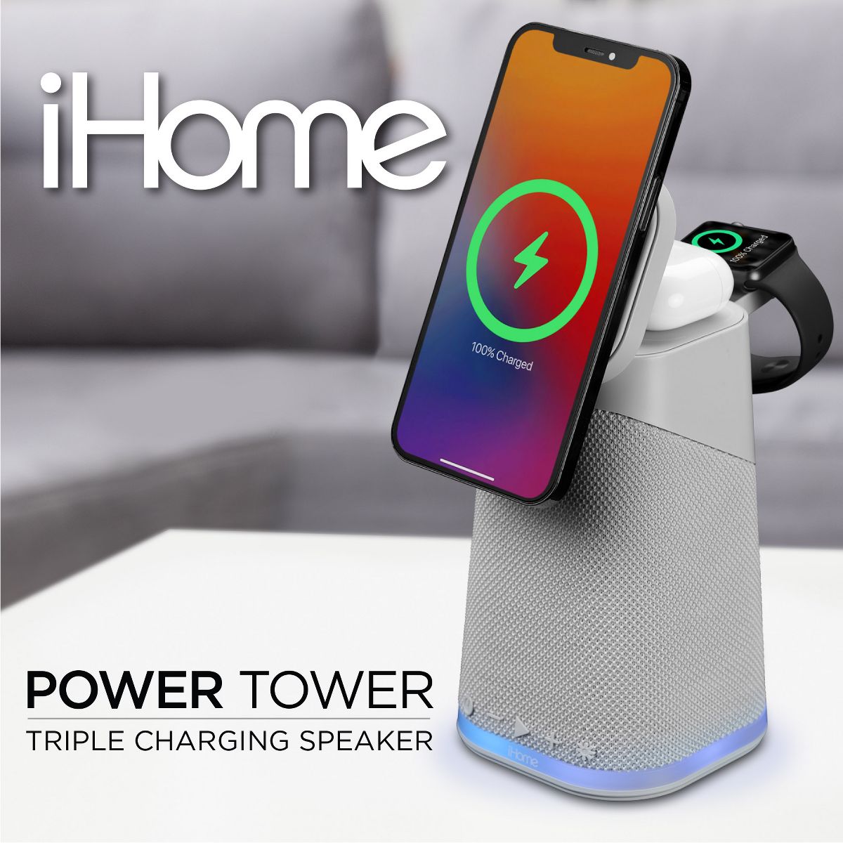 The iHome PowerTower Triple Wireless Charging Station lets you charge three devices simultaneously. Charge your iPhone or Android device via the Mag-Safe compatible fast wireless charging pad, and use the flip-up arm for powering your Apple Watch, too. Plus, an additional 5W charging pad is optimized especially for Apple AirPods. Connect via Bluetooth to wirelessly stream your favorite audio content, and use Apple Standby Mode to conveniently watch movies, cooking or makeup tutorials, all while your device is charging. Operates on 25W USBC PD wall adapter.