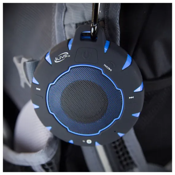Give your adventures a soundtrack with a rugged speaker that’s up to the task. The iLive Waterproof Wireless Speaker is perfect for the outdoors. Sand-proof and mud-proof, this speaker features a rubberized coating and will float if dropped in water. It has a built-in microphone and handsfree speakerphone for when you are on-the-go. With a wireless range of 60 feet, this speaker has a built-in rechargeable battery with approximate battery life of 8 hours at 50% volume. Includes a micro-USB to USB cable and detachable carabiner clip. Hit the trail, weather the storm, conquer the world – whatever your feat, you’ll be ready. Black/Blue. iLive is the ideal choice for your music enjoyment needs. LED pairing indicator.