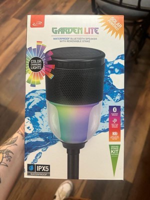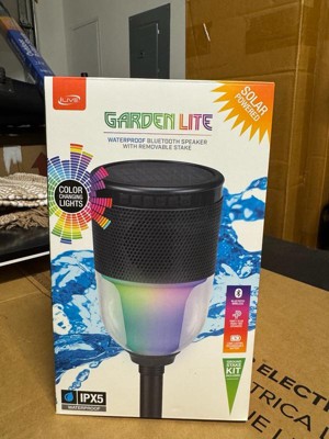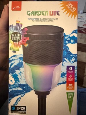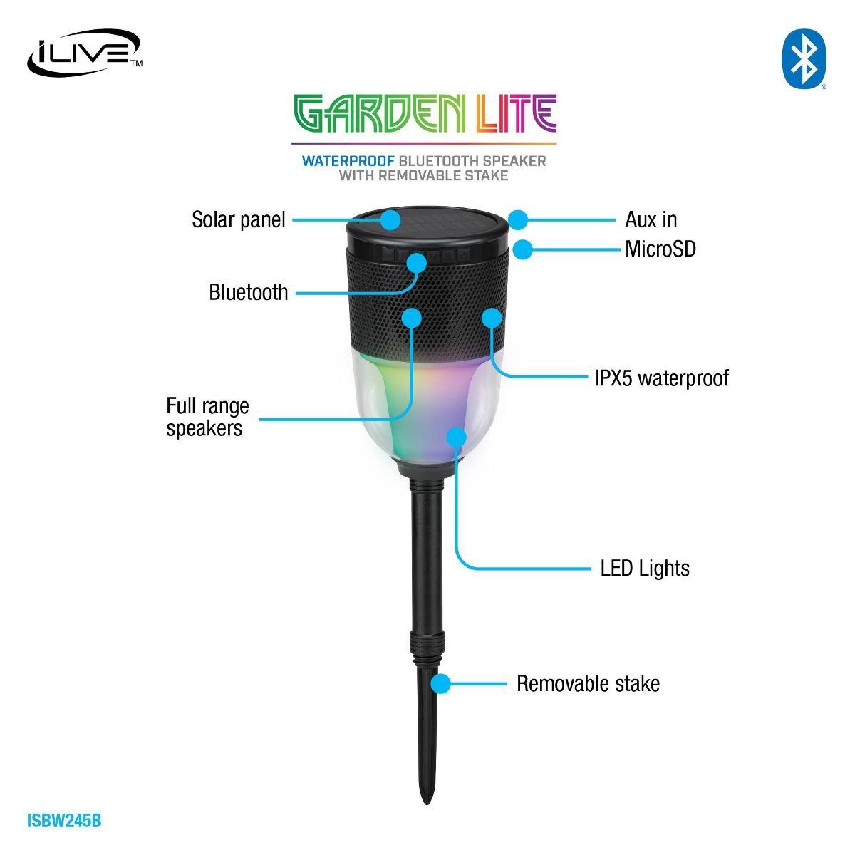 Do more with your outdoor sound solutions. The iLive GardenLite Speaker offers Bluetooth audio with a color changing LED light for your deck or garden. Set it on a table for background music at a barbecue then place them on stakes in the yard for extra light after the sun goes down. Don't worry about spills, the IPX5 protection has you covered.