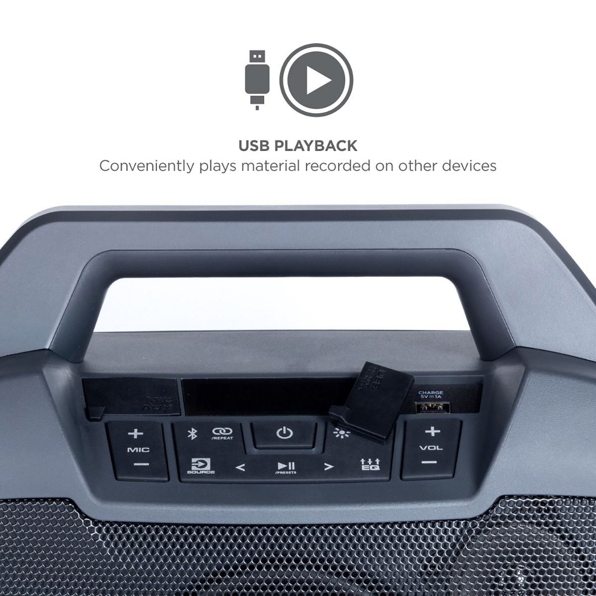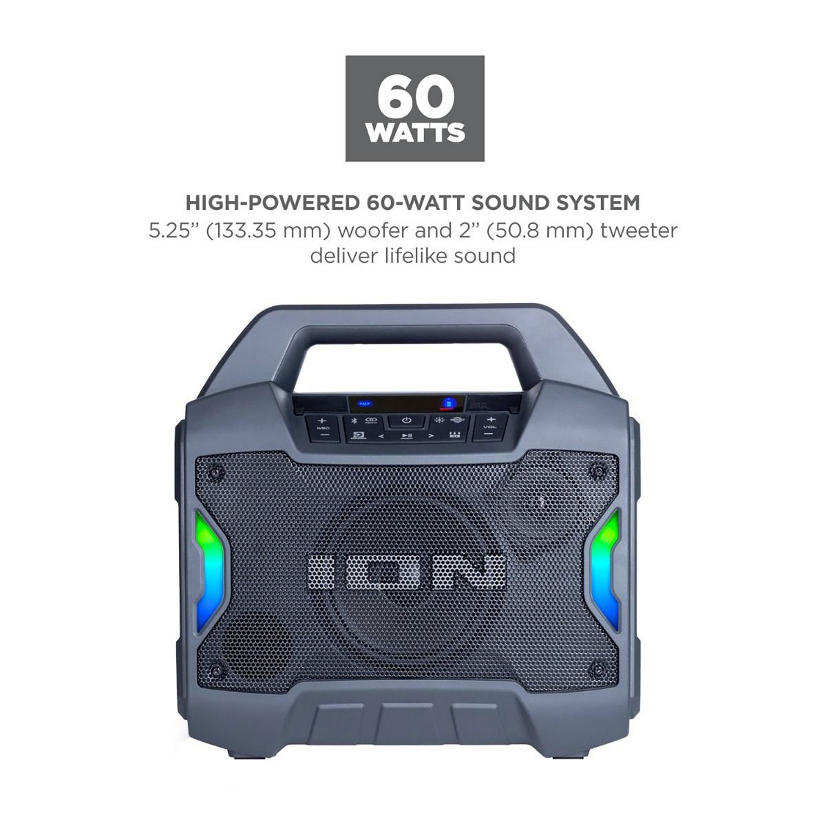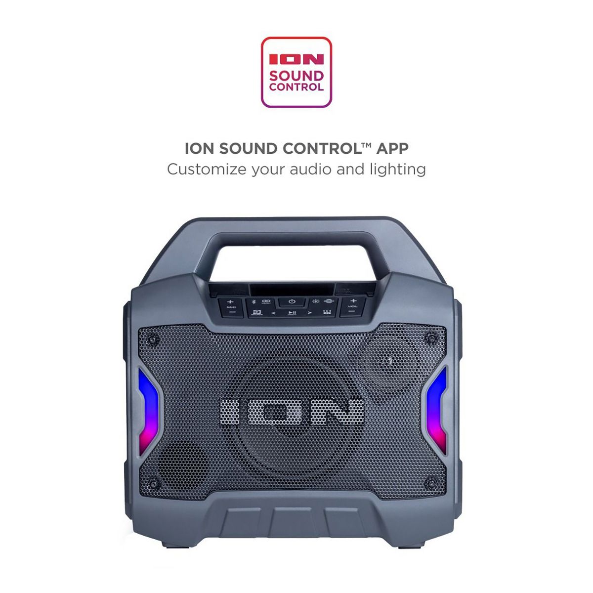Portability and convenience combine in this powerful Game Day™ Primetime indoor/outdoor portable Bluetooth® speaker from ION®. Whether before the game or a fun gathering in your backyard, you can count on Game Day™ Primetime to make any event a winning occasion. Boasting a powerful 60-watt output, your music will always sound its best. With its IPX5 water-resistant rating, with Game Day™ Primetime, there is no such thing as a rain delay! Safe to use by the pool or at the beach, the Game Day™ Primetime is the ideal portable speaker for use indoors or outside. The speaker has multi-colored LED lights on the front and the lighting can pulse to the music for exciting visual effects. You can stream music from any Bluetooth®-enabled device, and there is a long-life rechargeable Li-Ion battery. The free ION Sound Control™ app lets you control the audio and lighting functions from your mobile device. Count on Game Day™ Primetime to always deliver a big win.