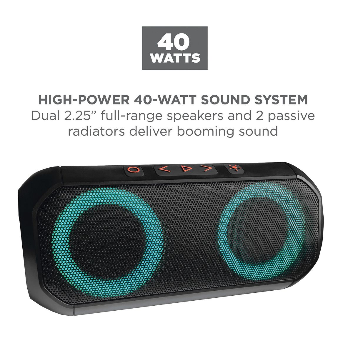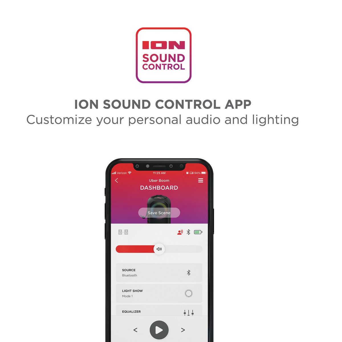 The ION Uber Boom Portable Bluetooth Speaker with LED Lights is designed to enhance your personal listening experience with its impressive features. The speaker lights move to the beat of your music, adding an extra element of fun, while the speaker’s long-lasting battery life of up to 10 hours provides ample power. It is also IP66 water-resistant and sandproof, so accidental spills, splashes, or sand won’t cause damage. The wireless speaker also features Stereo Link, which enables you to connect an additional Uber Boom for an even more immersive audio experience. The speaker also has SD Card playback so you can conveniently play material recorded on other devices. And the aux input allows easy connectivity to non-Bluetooth devices. The ION Sound Control app allows you to customize the audio and lighting. The speaker boasts a high-power 40-watt sound system with dual 2.25-in. full-range speakers and 2 passive radiators to deliver lifelike sound quality and fill a room with sound. Finally, the built-in microphone provides hands-free call answering. The Uber Boom portable wireless speaker is an ideal choice for music lovers who want to elevate their audio and visual experience. Indoors or outside, this portable Bluetooth boombox-style speaker will put the ‘boom boom’ into your music in any environment.