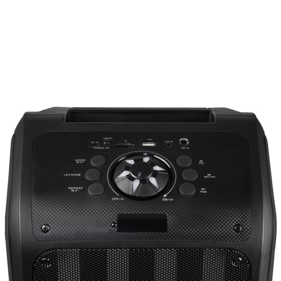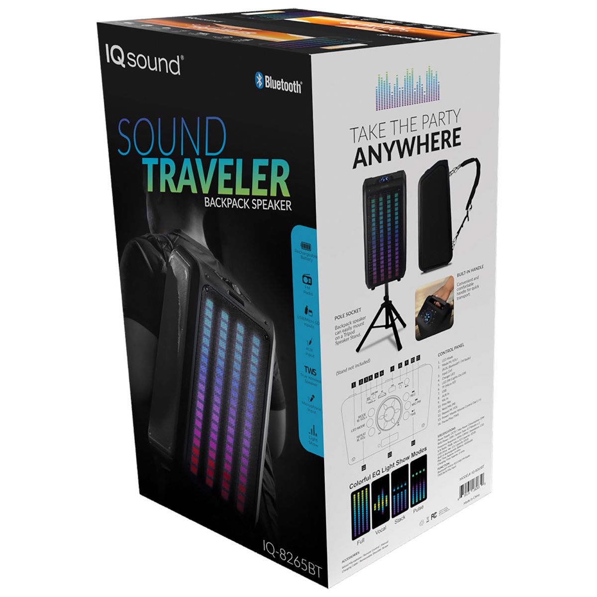 The IQ-8265BT Sound Traveler from IQ Sound® is the ultimate portable backpack speaker that delivers superior audio performance and versatility. Whether you're hosting a party, going camping, attending a festival, giving a talk, or simply want to listen to your favorite tunes on the go, this speaker system is the ideal choice. It features two 6.5-in. drivers that deliver rich, clear, and powerful sound. With its built-in Bluetooth® 5.0 technology, you can easily stream music from your smartphone, tablet, or other devices. Its LED light panel adds an extra layer of fun, with colorful lights dancing to the beat of your music. The party speaker also features True Wireless Stereo (TWS) technology, allowing you to connect a second Sound Traveler (sold separately) via Bluetooth® for an even more immersive audio experience. But what truly sets the IQ-8265BT apart is its flexibility and convenience. You can connect your non-Bluetooth® external audio devices via USB, microSD™, or aux inputs. It also has an FM radio, a microphone input with an included wired microphone, and a remote. This portable backpack speaker also has adjustable and removable shoulder straps, built-in rechargeable battery, and a play time of approximately 4 to 6 hours, making it a convenient and flexible choice for music lovers on the go. So, whether you're a DJ, music lover, or just want to add some excitement to your next outdoor adventure, the Sound Traveler Backpack Speaker has you covered.
