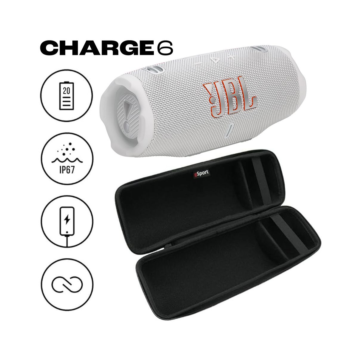 Play and charge anywhere. Like that newest season of our favorite show the JBL Charge is back and better than ever. The CHARGE 6 is everything we’ve come to love with new twists higher stakes and a bigger punch. With sound that slaps like never before better connectivity sturdier build and up to 28 hours of playtimethe CHARGE 6 is a portable audio beast. How do you pack more sound in the same iconic portable speaker package? With some redesigned hardware and our brand new JBL AI Sound Boost - a clever audio processing algorithm we’ve included under the hood. The end result? The CHARGE 6 hits way above it’s weight class filling our space with full rich immersive sound - without taking more space on our table. The CHARGE 6 is also one of the toughest portable speakers out there. It’s waterproof dustproof and drop-proof so it takes a beating without missing a beat. And true to its name the CHARGE 6 still includes a built-in powerbank to charge your mobile device while you continue to jam out to your tunes. What could be better than a new JBL CHARGE 6 in our lives? How about two? or four? Now you can effortlessly connect with other Auracast enabled JBL speakers to cover more ground (and more ears) with the same playlist whether we’re throwing the most sensational rooftop soiree or getting the crowd hyped before the ultimate pickle ball tourney. This is THE JBL CHARGE 6. Portable audio like we’ve never heard it before. Our Exclusive Bundle includes a gSport Carbon Fiber protective hardshell carrying case that holds your JBL CHARGE 6 and its accessories.