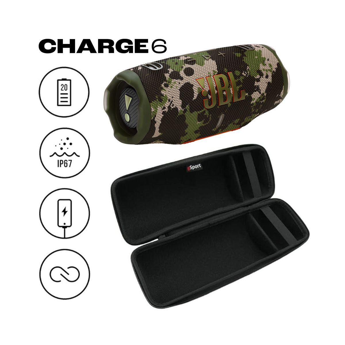 Play and charge anywhere. Like that newest season of our favorite show the JBL Charge is back and better than ever. The CHARGE 6 is everything we’ve come to love with new twists higher stakes and a bigger punch. With sound that slaps like never before better connectivity sturdier build and up to 28 hours of playtimethe CHARGE 6 is a portable audio beast. How do you pack more sound in the same iconic portable speaker package? With some redesigned hardware and our brand new JBL AI Sound Boost - a clever audio processing algorithm we’ve included under the hood. The end result? The CHARGE 6 hits way above it’s weight class filling our space with full rich immersive sound - without taking more space on our table. The CHARGE 6 is also one of the toughest portable speakers out there. It’s waterproof dustproof and drop-proof so it takes a beating without missing a beat. And true to its name the CHARGE 6 still includes a built-in powerbank to charge your mobile device while you continue to jam out to your tunes. What could be better than a new JBL CHARGE 6 in our lives? How about two? or four? Now you can effortlessly connect with other Auracast enabled JBL speakers to cover more ground (and more ears) with the same playlist whether we’re throwing the most sensational rooftop soiree or getting the crowd hyped before the ultimate pickle ball tourney. This is THE JBL CHARGE 6. Portable audio like we’ve never heard it before. Our Exclusive Bundle includes a gSport Carbon Fiber protective hardshell carrying case that holds your JBL CHARGE 6 and its accessories.
