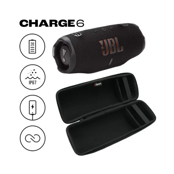 Play and charge anywhere. Like that newest season of our favorite show the JBL Charge is back and better than ever. The CHARGE 6 is everything we’ve come to love with new twists higher stakes and a bigger punch. With sound that slaps like never before better connectivity sturdier build and up to 28 hours of playtimethe CHARGE 6 is a portable audio beast. How do you pack more sound in the same iconic portable speaker package? With some redesigned hardware and our brand new JBL AI Sound Boost - a clever audio processing algorithm we’ve included under the hood. The end result? The CHARGE 6 hits way above it’s weight class filling our space with full rich immersive sound - without taking more space on our table. The CHARGE 6 is also one of the toughest portable speakers out there. It’s waterproof dustproof and drop-proof so it takes a beating without missing a beat. And true to its name the CHARGE 6 still includes a built-in powerbank to charge your mobile device while you continue to jam out to your tunes. What could be better than a new JBL CHARGE 6 in our lives? How about two? or four? Now you can effortlessly connect with other Auracast enabled JBL speakers to cover more ground (and more ears) with the same playlist whether we’re throwing the most sensational rooftop soiree or getting the crowd hyped before the ultimate pickle ball tourney. This is THE JBL CHARGE 6. Portable audio like we’ve never heard it before. Our Exclusive Bundle includes a gSport Carbon Fiber protective hardshell carrying case that holds your JBL CHARGE 6 and its accessories.