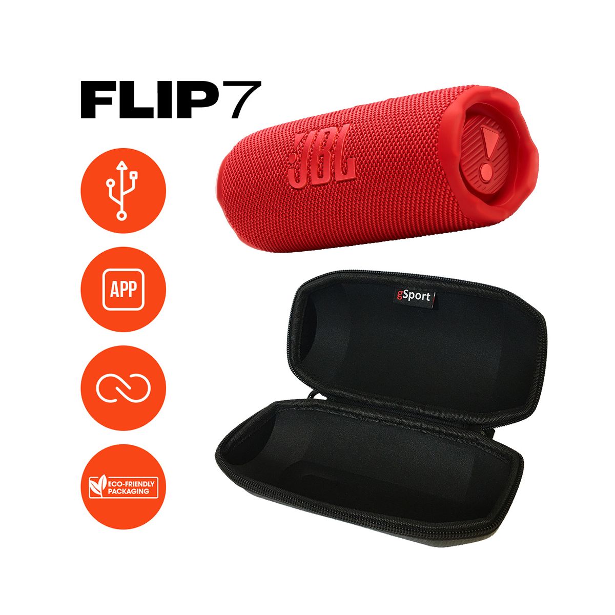 Bold sound for every adventure and the soundtrack to your life right in the palm of your hands. The JBL FLIP 7 is undefeated JBL sound that travels with us wherever we go. Because music has no boundaries and neither should we. Whether we’re hosting a beach party relaxing in your backyard or setting the mood for a cozy night in the FLIP 7 is designed to enhance any experience anywhere life takes us. And now your signature sound is bigger and bolder than ever thanks to JBL’s AI Sound Boost. The end result? The FLIP 7 leaves your friends and family wondering where all that big glorious sound could possibly be coming from. But it’s not just pretty and powerful. The FLIP 7 takes a beating without missing a beat boasting industry-leading IP68 waterproof dustproof and drop-proof. Plus with new Playtime Boost we can enjoy up to 16 hours of playtime—because the moment should only ever stop on your terms. Wouldn’t it be great to share the sweet sound of JBL far and wide? Now we can. Effortlessly connect with other Auracast-enabled JBL speakers to cover more ground (and more ears) with the same playlist whether we’re touring the town with your cycling crew or extending your dinner party to the back patio and the front yard. In short this is not the average portable speaker. It’s a pint-sized audio boss. Our Exclusive Bundle includes a gSport Carbon Fiber protective hardshell carrying case that holds your JBL FLIP 7 and its accessories.