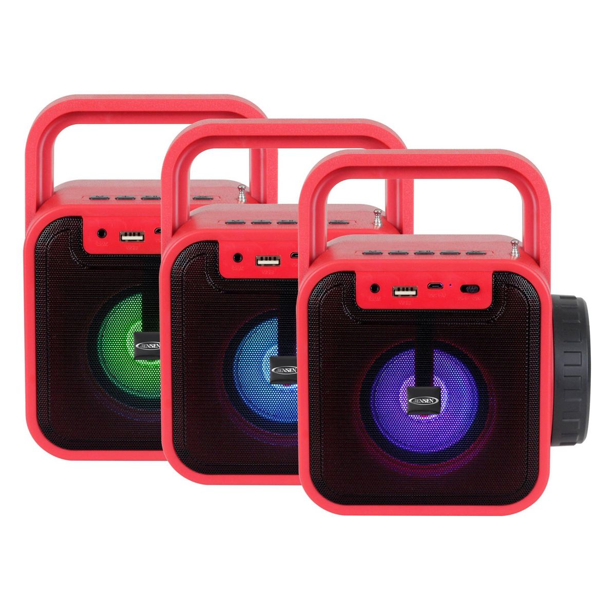 JENSEN Portable Bluetooth Rechargeable Speaker with Built-in Emergency USB Charging Port FM - Red: Android & iOS Compatible, AM/FM Radio