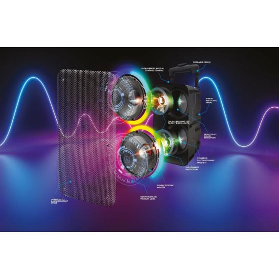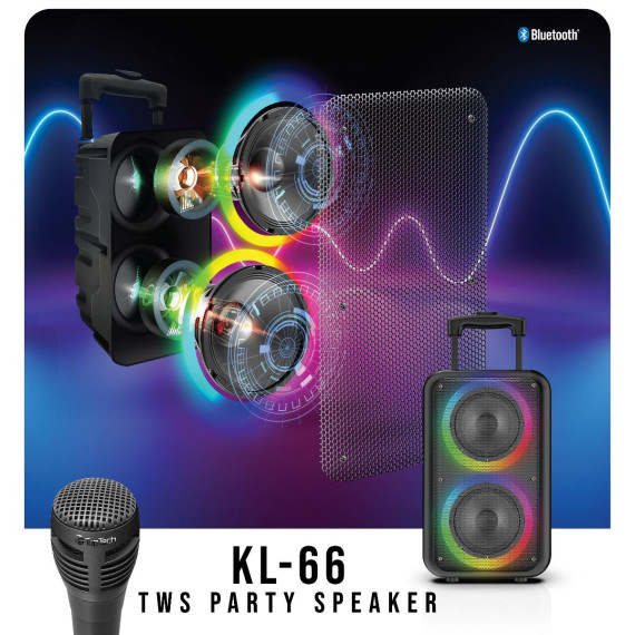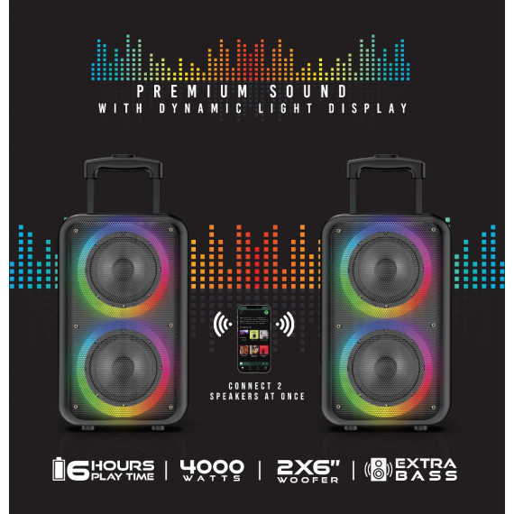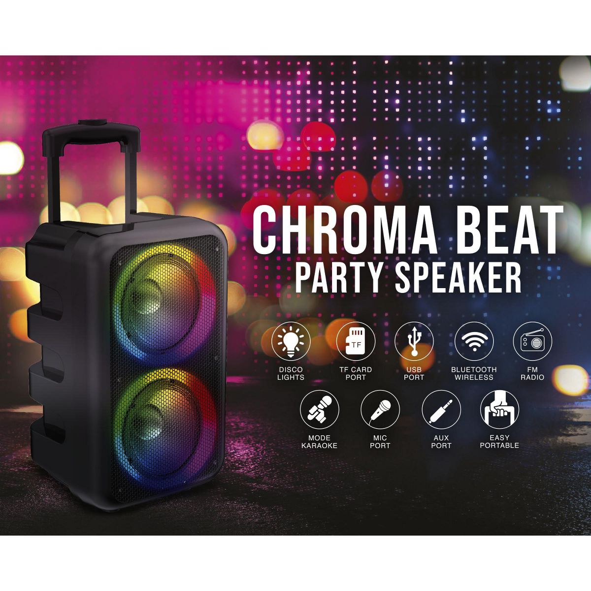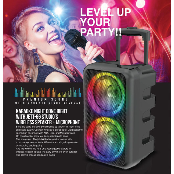 The JET-66 Chroma Beat speaker is designed to deliver powerful sound and vibrant lighting for any party or event. With powerful music power, dual 6'' woofers, and extra bass, it ensures a deep, rich audio experience. The integrated disco lights, microphone input, and guitar jack add versatility, while Bluetooth wireless connectivity allows for easy pairing with most devices. Whether you're hosting a party, enjoying karaoke, or performing live, the JET-66 Chroma Beat is your perfect sound companion. Built for portability with a rechargeable battery, it's ready to go wherever the music takes you.