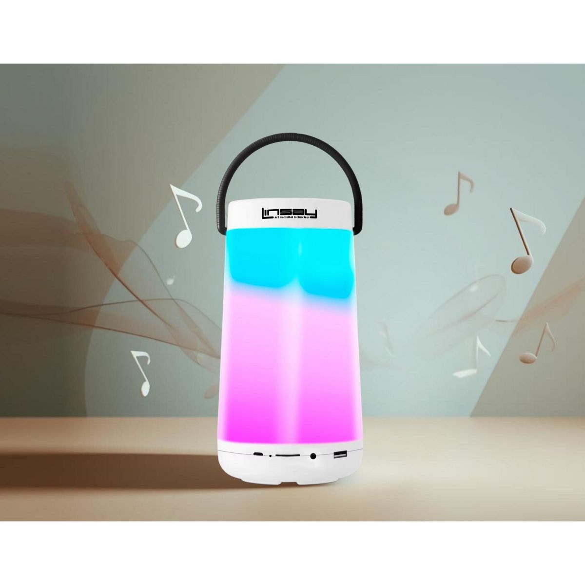 Meet the New LINSAY SLP-500CW LED Light Show Indoor/Outdoor Portable Bluetooth Speaker White which features 10 multi colorful LED lighting. Place it outdoor to brighten your surroundings with a 360¡ multi light show. Including a 360-surrounding sound to experience an exciting listening show. Loud and Deep sound by our latest Bluetooth technology.