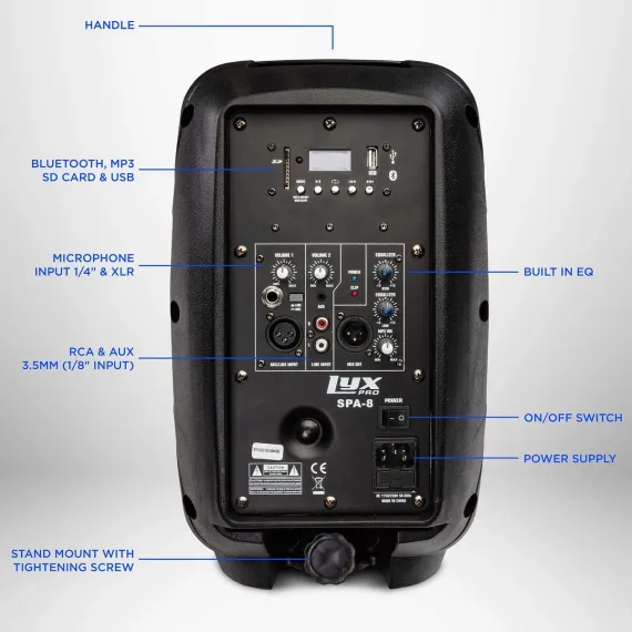 The small PA system includes Mp3 EQ control Section, XLR microphone input, SD Card Slot & USB Input, 3.5mm AUX input w/Per-input level knobs, R/L RCA Inputs w/Per-Input level knobs, XLR 1/4" inputs with Mic/Line switch. If you’re playing ambient music, practicing the guitar, singing along to party hits, or sharing morning announcements, you’ll enjoy powerful sound clarity with this powered Bluetooth speaker.