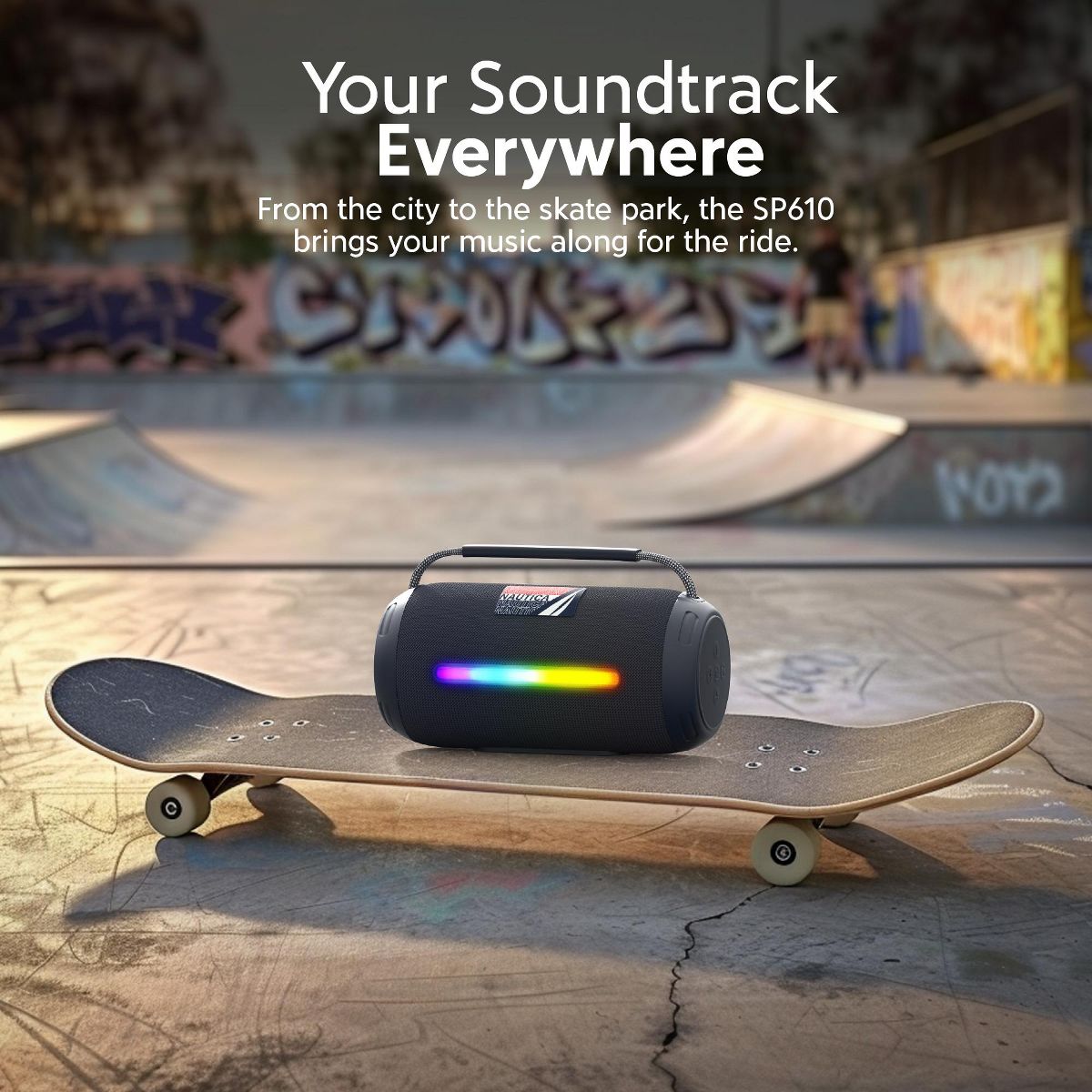 The Nautica SP610 Bluetooth Portable Speaker is here to bring the party wherever you go! With its stylish fabric cover and rubber soft-touch finish, this wireless speaker with Bluetooth functionality is as durable as it is good-looking. Packed with 15W PMPO power, this travel speaker delivers clear highs and deep bass, filling any room or outdoor space with vibrant sound. Bluetooth 5.3 ensures easy and stable connectivity up to 10 meters, and with TWS, you can pair two SP600s for a total of 30W of stereo sound. Enjoy up to 8 hours of playtime, and control everything with the easy buttons or switch up the vibe with 5 ambient light modes. Need a quick connection? Use the USB, SD, or AUX inputs to keep the music going! Plus, with an IP5 splash-proof rating, you can take this outdoor Bluetooth speaker anywhere without worrying about the weather. Add this rechargeable speaker to your collection of travel accessories today - this cool gadget is the perfect camping companion, beach vacation essential, festival essential, and everyday music player!