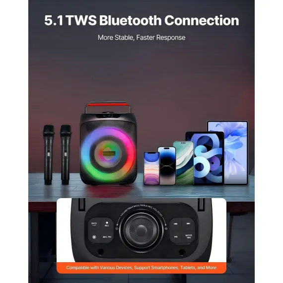 This portable karaoke machine delivers powerful 30W stereo sound with a 6.5-inch subwoofer and tweeter for clear vocals and deep bass. Featuring Bluetooth connectivity, colorful LED lights, and dual wireless microphones, it’s designed for home karaoke, parties, and gatherings. Multiple input options and a built-in rechargeable battery make it easy to enjoy music and singing anywhere.