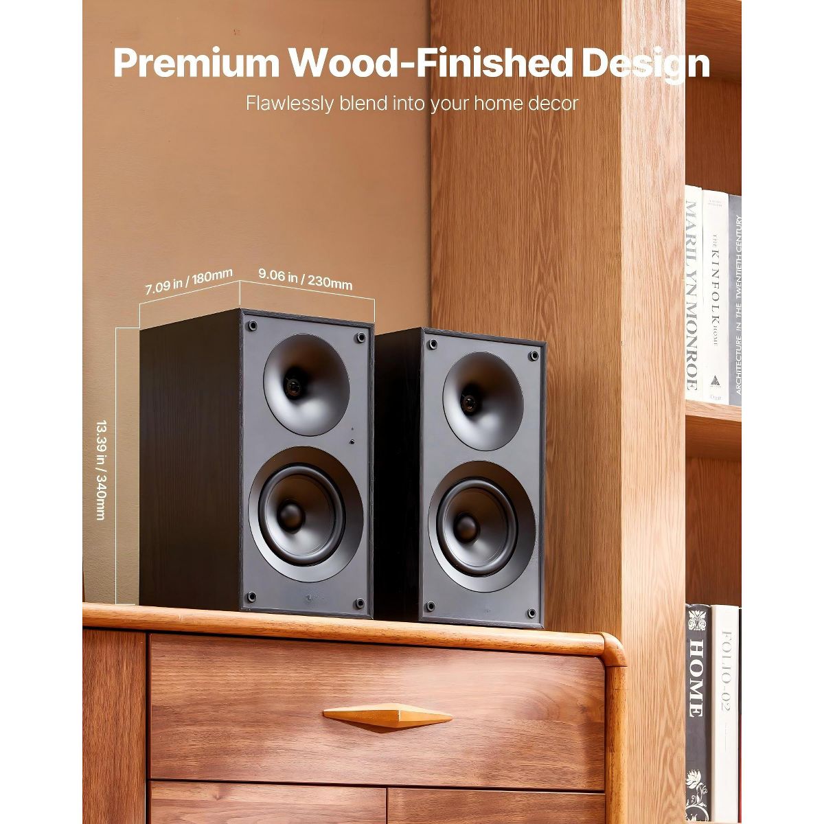 These active bookshelf speakers deliver balanced stereo sound with a powerful 5.25-inch woofer and 1-inch tweeter housed in a solid wooden enclosure. Supporting Bluetooth and multiple wired inputs, they connect easily to turntables, PCs, TVs, and audio devices. With built-in amplification and convenient remote control, they offer room-filling sound in a compact, stylish form for home listening and desktop setups.