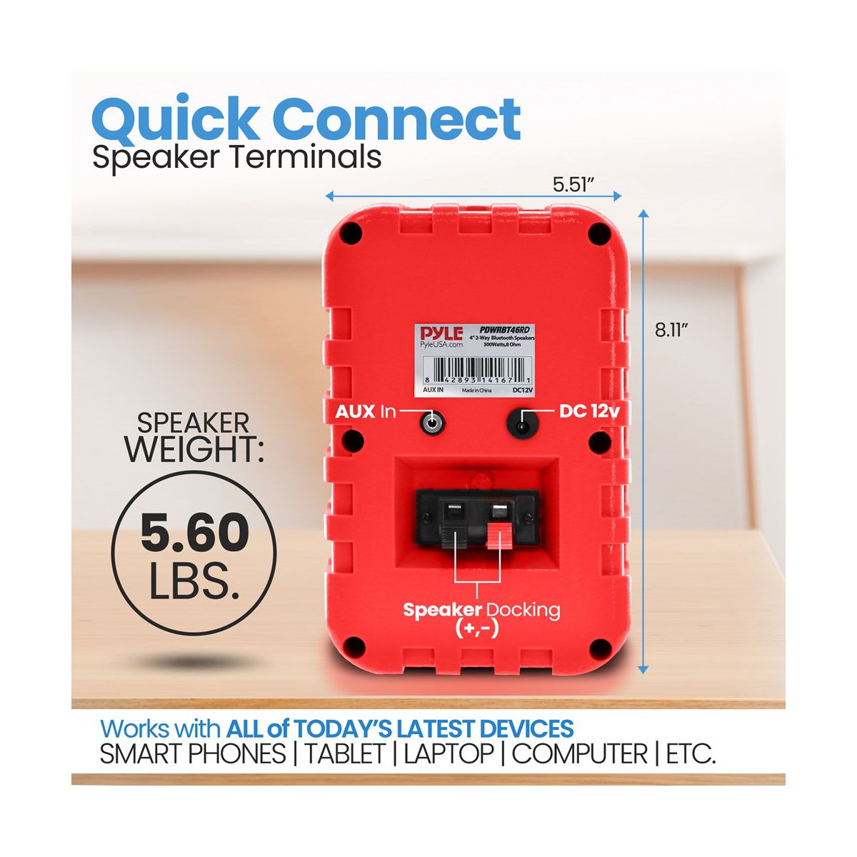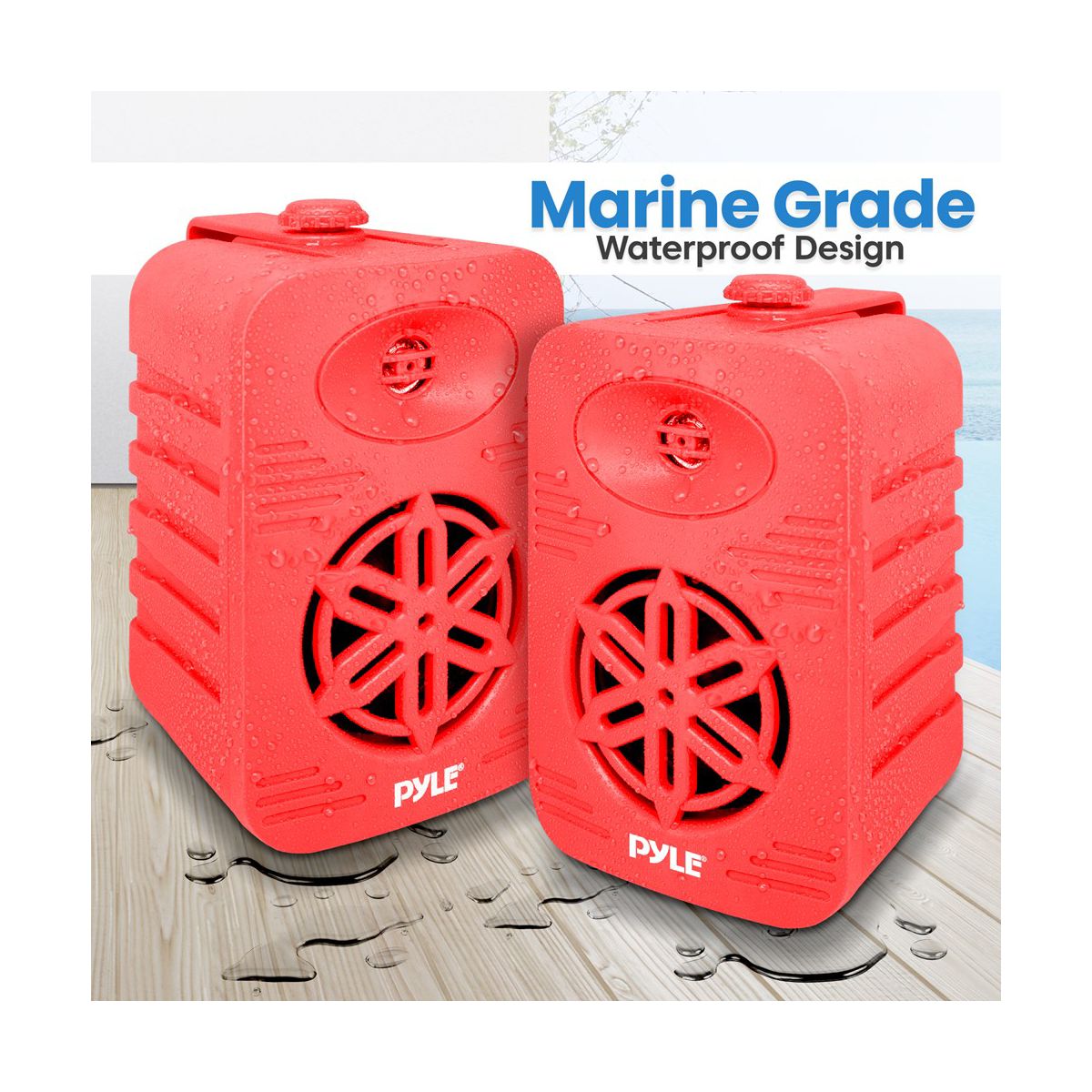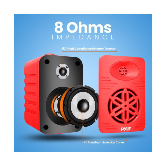 The Pyle 4” 2-Way Indoor/Outdoor Bluetooth Speaker System in vibrant red is perfect for bringing high-quality audio to any outdoor or indoor space. Featuring a completely waterproof design, these speakers are ideal for use on boats, decks, patios, poolside, or any other outdoor setting. The 4” aluminum injection cone subwoofers and 1/2” high compliance polymer tweeters deliver rich, dynamic sound with a maximum power output of 300 Watts. With a built-in Bluetooth receiver, you can stream music wirelessly from your smartphone, tablet, or computer. The heavy-duty ABS construction ensures long-lasting durability, while the quick connect speaker terminals make installation easy. Enjoy excellent audio performance and reliable Bluetooth connectivity with the Pyle Indoor/Outdoor Speaker System.