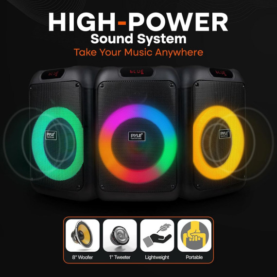 Pyle 8" Wireless Bluetooth Party Speaker with LED Lights, 100W, Rechargeable Battery, Mic Input, FM Radio, and Remote Control