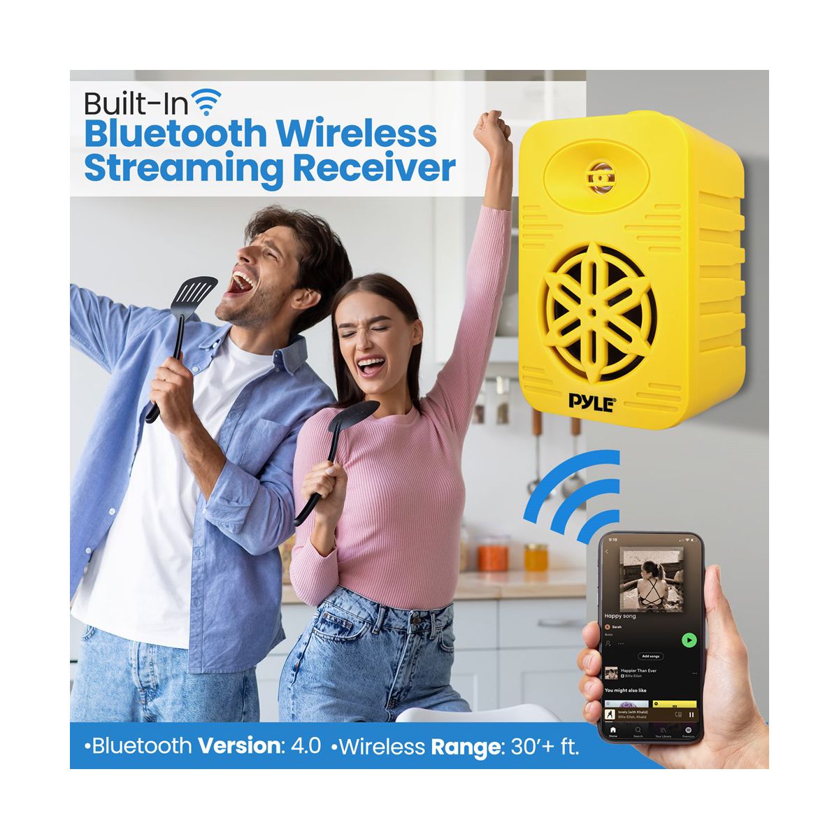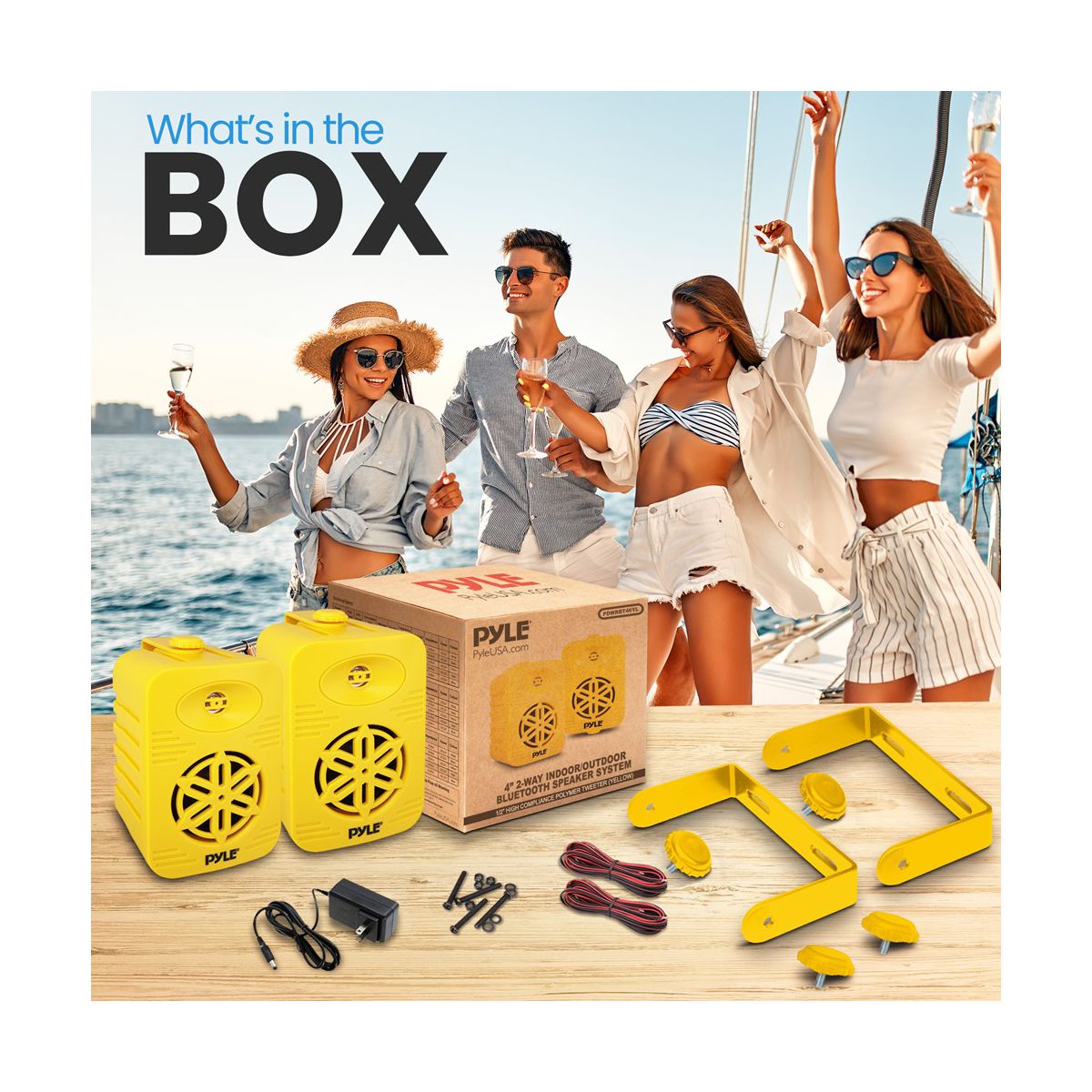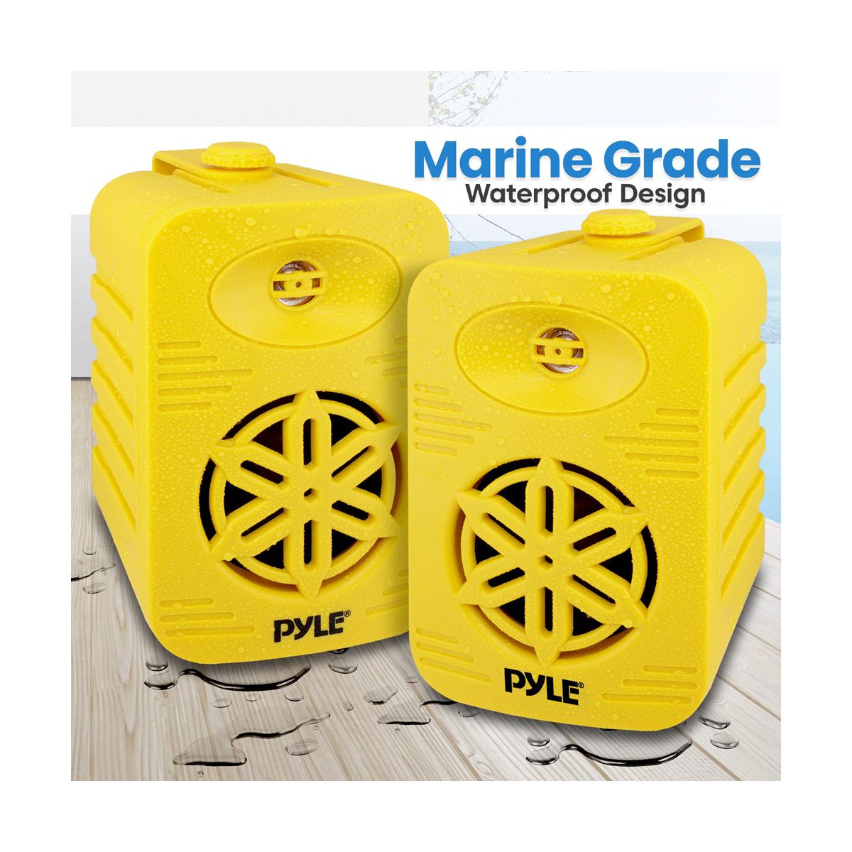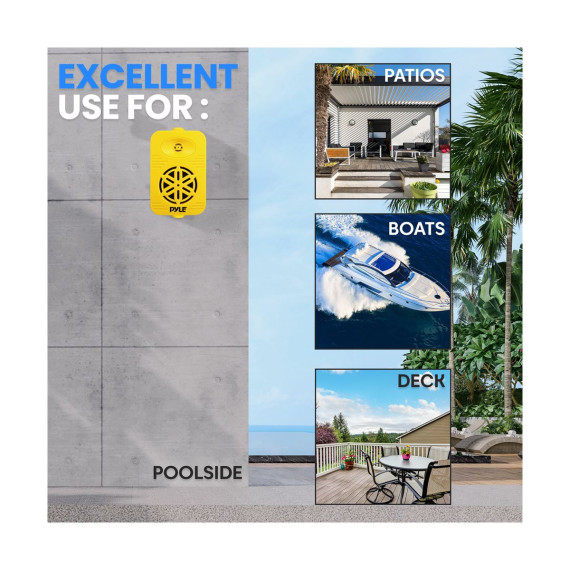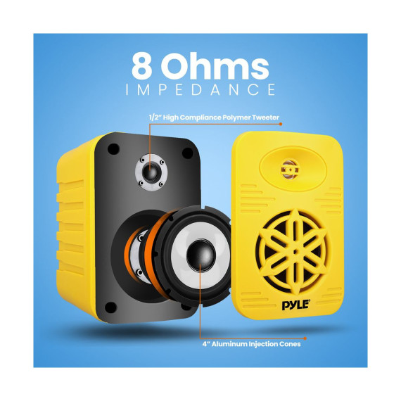 1/2” High Compliance Polymer Tweeter Bluetooth Wireless Music Streaming Lightweight & Compact Size Heavy Duty ABS Construction Quick Connect Speaker Terminals Completely Waterproof Design Capacitor Crossover Network Excellent for Use On Boats/ Marine/ Decks/ Patios/ Poolside/ Outdoors Bluetooth Connectivity: Built-in Bluetooth Wireless Streaming Receiver Simple & Hassle-Free Connection Works with All of Today’s Latest Devices (Smartphone, Tablet, Laptop, Computer, etc.) Bluetooth Version: 4.0 Bluetooth Network Name: ‘Pyle’ Bluetooth Network Password: ‘0000’ (4 Zeroes) Wireless Range: 30’+ ft. What's in the Box: (2) Speakers Mounting Brackets Mounting Hardware Speaker Cable Power Adapter Technical Specs: Construction Material: ABS Subwoofers: 3.5” Aluminum Injection Cones Tweeters: 1/2” High Compliance Polymer Tweeter Max Power: 200 Watts RMS Power: 100 Watts Magnet: 24 Oz Frequency Response: 70-21KHz Impedance: 8 Ohm Sensitivity: 90dB Speaker Cable Length: 11.48 ft. / 3.5m Power Output: DC12V, 2A (Power Adapter) Product Dimensions (D x W x H): 3.74’’ x 3.78’’ x 5.91’’ -inches Sold as: 1 Weight: 3.33 lbs.