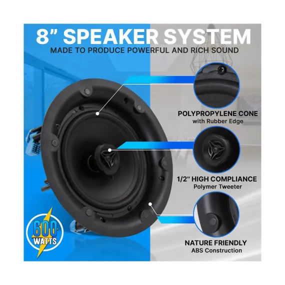 The Pyle PDIC8LT 8" In-Wall / In-Ceiling Speaker provides high-quality sound in a space-saving, flush-mount design. Ideal for both home and commercial settings, this speaker offers 600W max power and features a built-in 70V transformer with multiple tapping options for flexible installation. Whether you're setting up an audio system for a home theater, office, or public address system, the PDIC8LT ensures a clear, balanced audio experience with its 2-way full-range stereo sound. The detachable magnetic grill allows for easy cleaning and maintenance, while the speaker's environmentally friendly ABS construction ensures long-lasting durability. Its high-sensitivity foam edge and high-compliance dome tweeter provide crystal-clear sound reproduction, perfect for any environment.