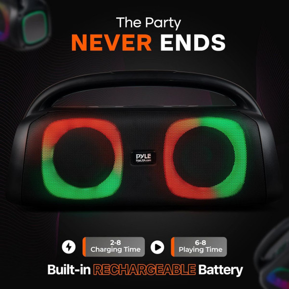 The Pyle PPHP26HD is a dual 5'' Bluetooth portable boombox speaker designed to deliver immersive audio with deep bass. With Bluetooth wireless streaming, you can easily pair your smartphone, tablet, or laptop to enjoy music anywhere. The speaker features a built-in rechargeable battery that lasts up to 8 hours of use and LED lights that sync to the music, providing a fun visual experience. It also includes a microphone input for karaoke, an FM radio, and USB/TF card support, making it ideal for parties and gatherings.