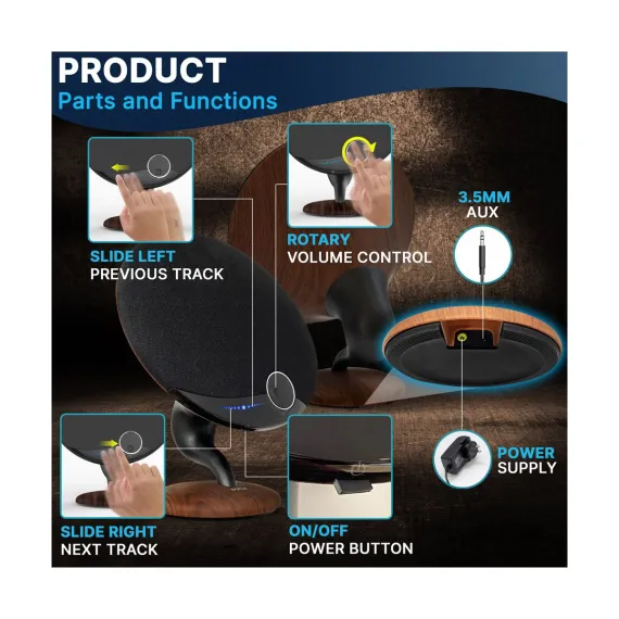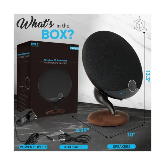 The Pyle PGMSP100 Wireless Bluetooth Gramophone Speaker combines classic design with modern audio technology. Featuring a built-in subwoofer and mid-range speakers, this gramophone delivers symphonic sound quality. The Bluetooth connectivity allows for wireless streaming from any device, while the elegant touch screen and rotary volume control offer intuitive operation. This speaker is also capable of twin pairing, allowing you to connect two units for a stereo experience.