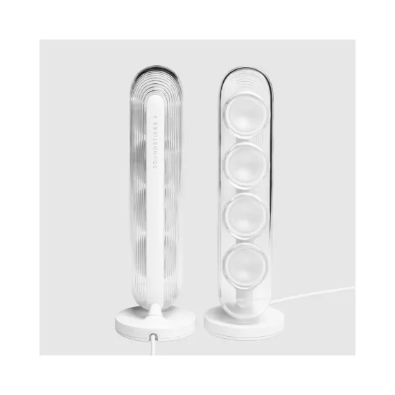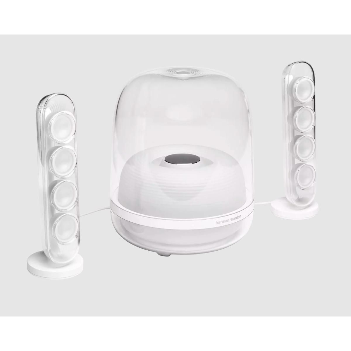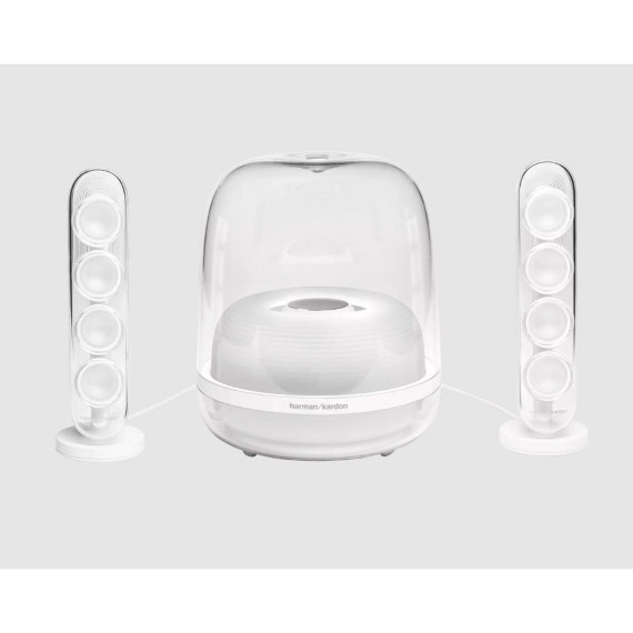 Fill the room with rich audio using the SoundSticks 4 Bluetooth Wireless 2.1 Speaker System from Harman Kardon. With an iconic transparent dome design, the wireless Bluetooth speaker system blends into almost any room or setting. The full-range speakers produce to 140W of power and have a 5.25" downward firing subwoofer for high-fidelity sound for music, movies, and more.