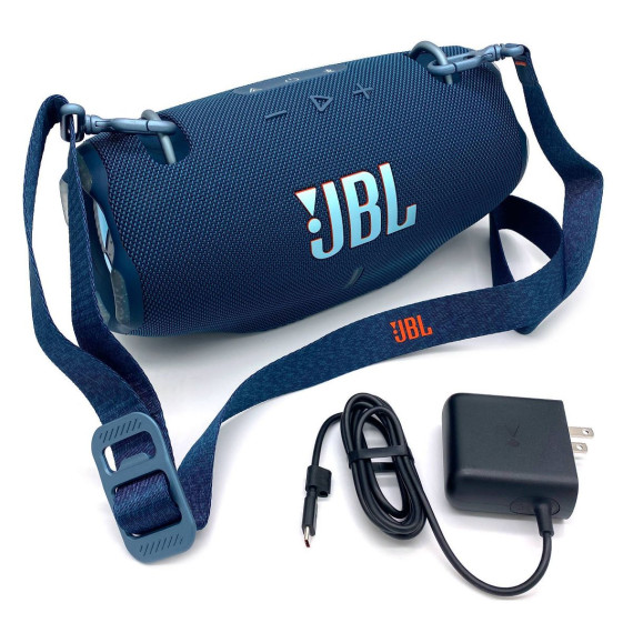 The JBL Xtreme 4 portable waterproof speaker delivers next-level massive JBL Pro Sound with amazing dynamics, even at top volume, thanks to two powerful woofers and two tweeters. Dual pumping JBL passive radiators give you deeper bass that moves you. Want to take your music outside? The handy shoulder strap makes it easy, while the rugged rubber bumpers and IP67 waterproof and dustproof rating mean that a sudden downpour or a dunk in the lake will not stop the fun. When it is time to create an even bigger audio experience, pair two Xtreme 4s for stereo sound. Or for your next party, use Auracast to connect the Xtreme 4 with any compatible JBL portable speakers, so your friends lounging poolside will vibe to the same playlist as the ones chatting indoors. 24 hours of playtime and a convenient power bank for your device mean you will not have to recharge until morning. All this, plus it is made with recycled plastic and recycled fabric. The JBL Xtreme 4 brings thrilling sound with you everywhere.